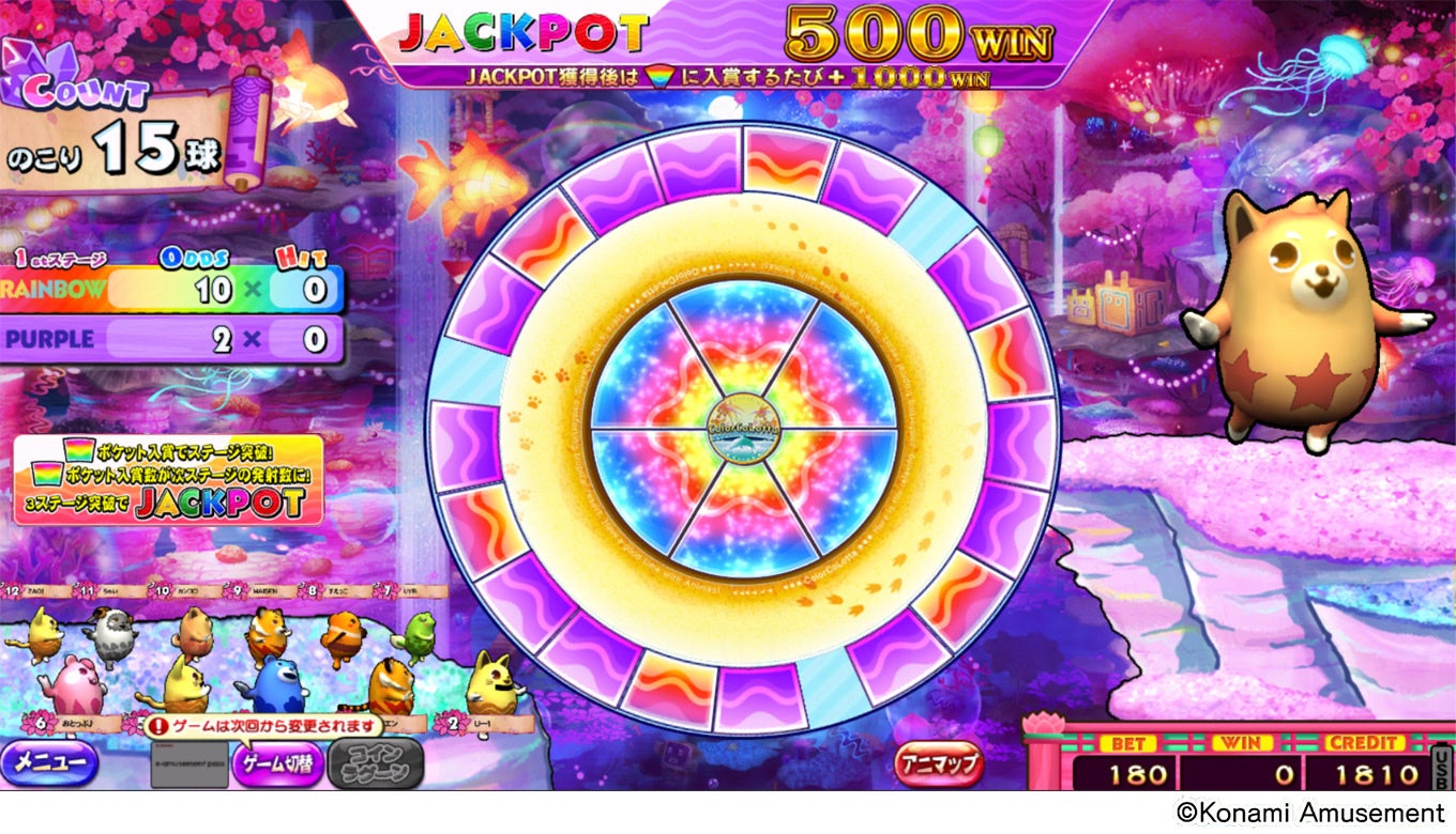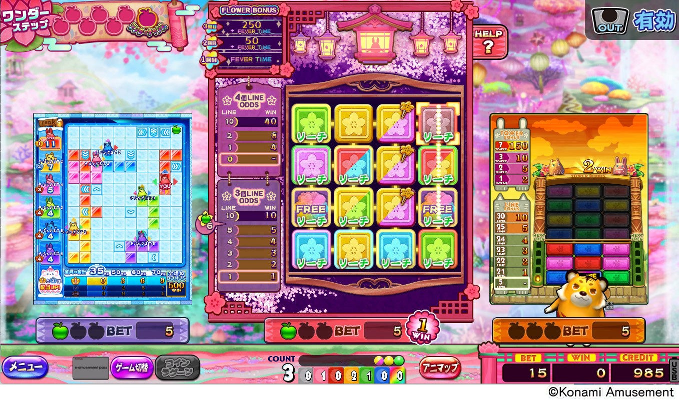 今作ではステージ突破型の「アメジストJACKPOT CHANCE」、同じ色のパネルでラインを作って配当を獲得するゲーム「花色あわせ」が追加され、さらに、メインモニターを使用した新ゲーム「すごろくチャレンジ」、リニューアルされたワンダーチャンスなど、盛りだくさんの内容となっています。