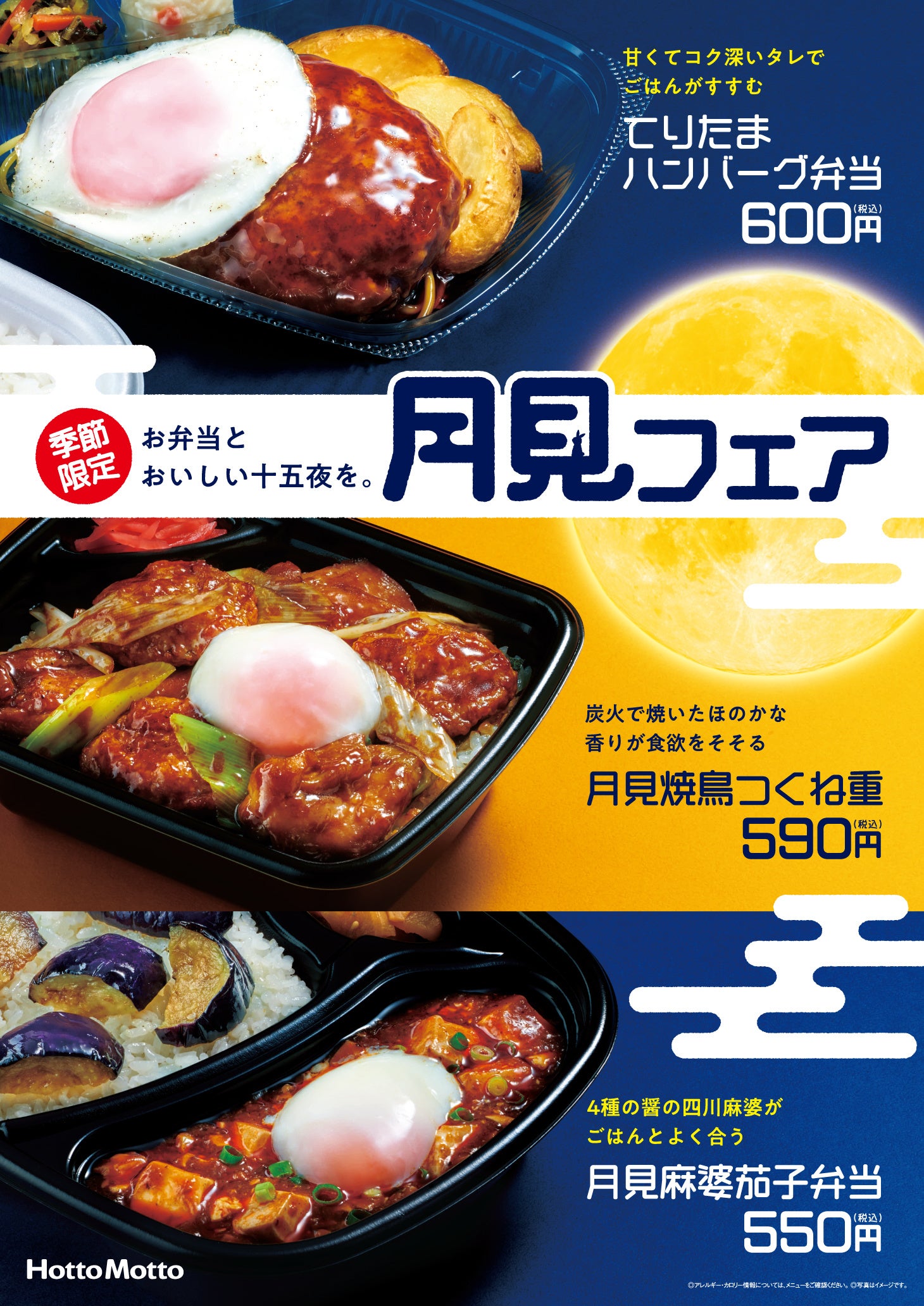 「ほっともっと」では9月10日の「十五夜」にちなみ、玉子を月に見立てた商品を季節限定にて販売する「月見フェア」を昨年より開催しています。今年は昨年人気だった2商品に新商品を加えた、装いも異なる全3種のご用意です。