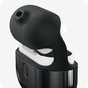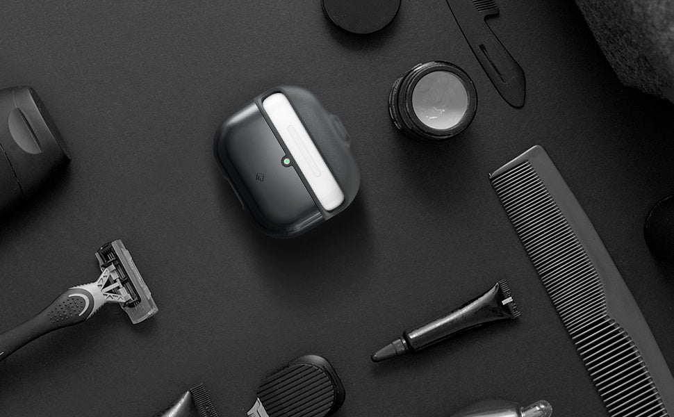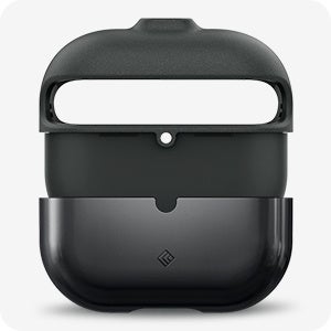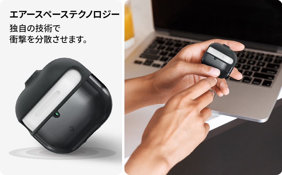 シリコンケース及びPC(ポリカーボネート)カバーを採用したハイブリッドケースです。高い耐久性はもちろん、埃がつきやすいというシリコンの難点を克服しました。シリコンケースがAirPodsのキャップから本体までしっかり固定する形となっているため、イヤホンユニットの紛失を予防します。また、光沢処理されたPCカバーで、高級感を引き上げます。