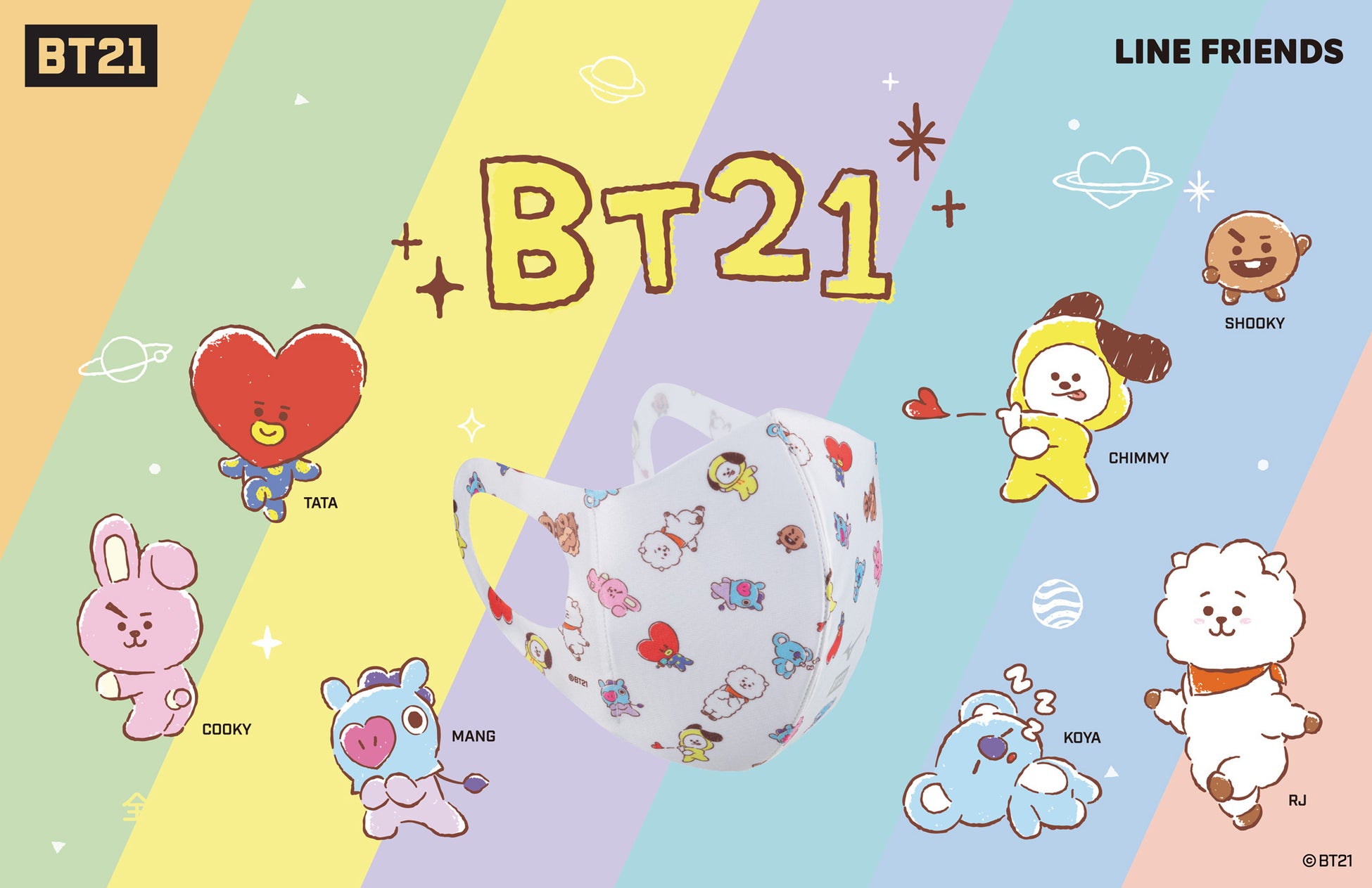 全宇宙に愛を届けたいBT惑星のプリンス、TATAは親友である宇宙ロボットVANと一緒に地球を訪れることになります。地球に愛を届ける最も良い方法は「有名なスターになること」であると思ったTATAは仲間を探し始めました。そしてKOYA,RJ,SHOOKY,MANG,CHIMMY,COOKYに出会い、宇宙最高のスターを目指す「BT21」が誕生しました。それぞれが違う魅力で、みんな一緒になるとさらに輝く「BT21」!夢に向かって走る「BT21」の愉快で、時には感動的な物語が今日も続きます。