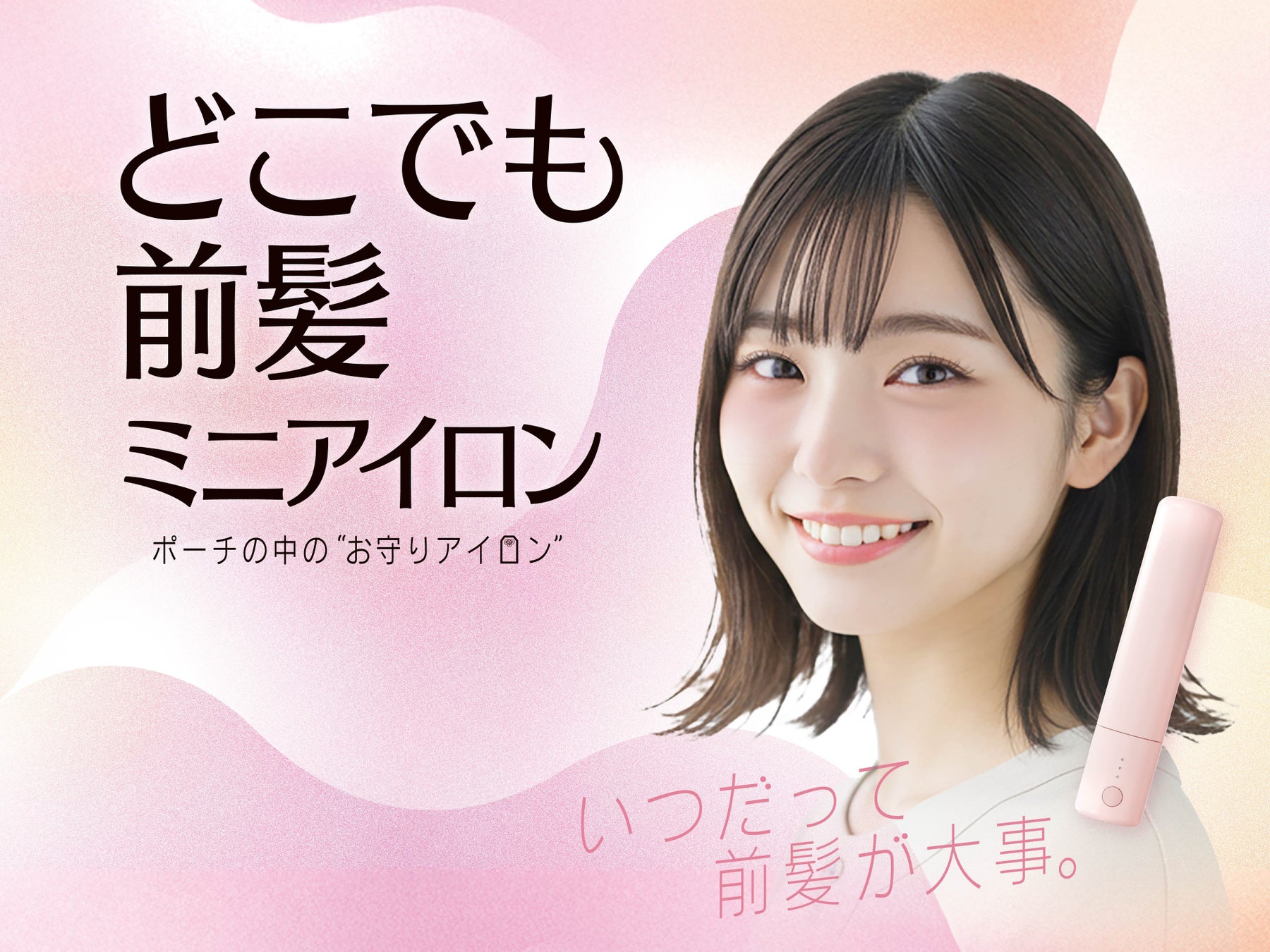 新商品は、持ち運びに便利なミニアイロン。前髪のお直しがいつでもどこでも手軽にでき、外出先でもスタイリングが可能。重さは約たまご1個分(約50g)と軽量で、長さ12cm直径2.5cmの手のひらサイズ。ポーチにもすっきり収まります。温度は120℃と140℃の2段階調整が可能で、セラミックコーティングプレートのため、髪へのダメージを抑えながら使用できます。約30分で自動的に電源が切れるオートオフ機能や加熱保護機能もついているので、安心して使えます。前髪ひとつで印象を変えてくれる、ポーチの中の“お守りアイロン”です。
