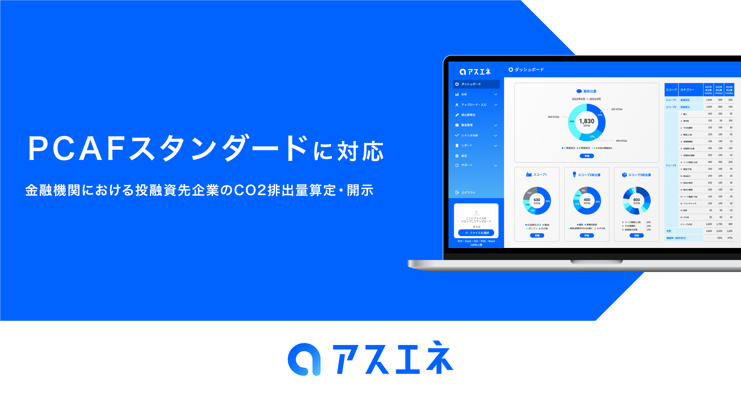 CO2排出量見える化・削減クラウド「アスエネ」、金融機関向けGHG排出量開示の環境イニシアチブである「PCAFスタンダード」への対応を開始
