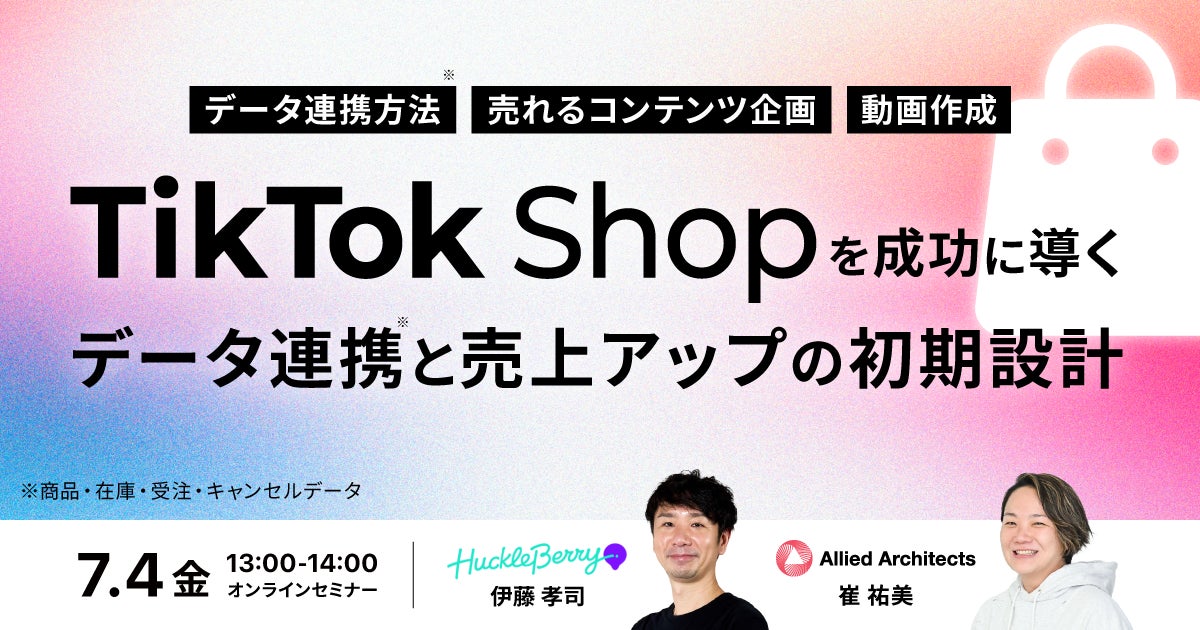 データとクリエイティブの力でマーケティングコミュケーションを設計し、企業のマーケティングAXを支援するアライドアーキテクツ株式会社(本社:東京都渋谷区、取締役社長:村岡弥真人、証券コード:6081、以下「当社」)は、ECカートやモールとTikTok Shop間のデータ連携(商品、在庫、受注、キャンセル)を自動化するiPaaSサービス 「CoreLink for TikTok Shop」を提供する、株式会社ハックルベリー(東京都世田谷区、代表取締役社長:安藤 祐輔、以下「ハックルベリー」)と共催で、無料セミナー「TikTok Shopを成功に導くデータ連携※と売上アップの初期設計〜各データ連携方法や、売れるコンテンツ企画から動画作成まで徹底解説!〜」を7月4日(金)に開催いたします。ECカートシステムなどとの連携方法や、購買につながるコンテンツ企画のポイントなど事例を交えてご紹介します。