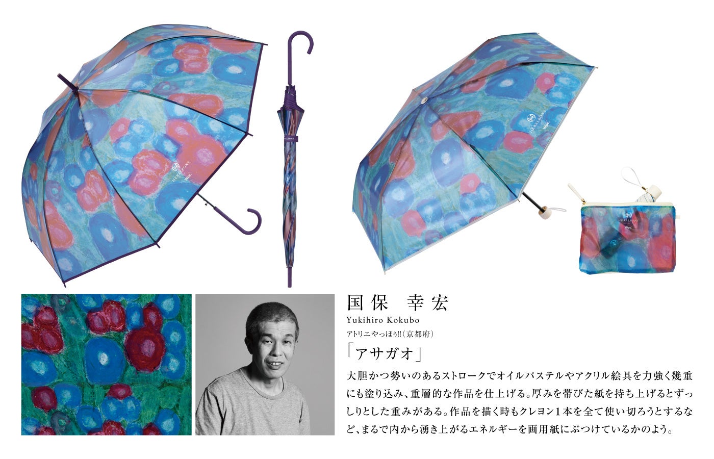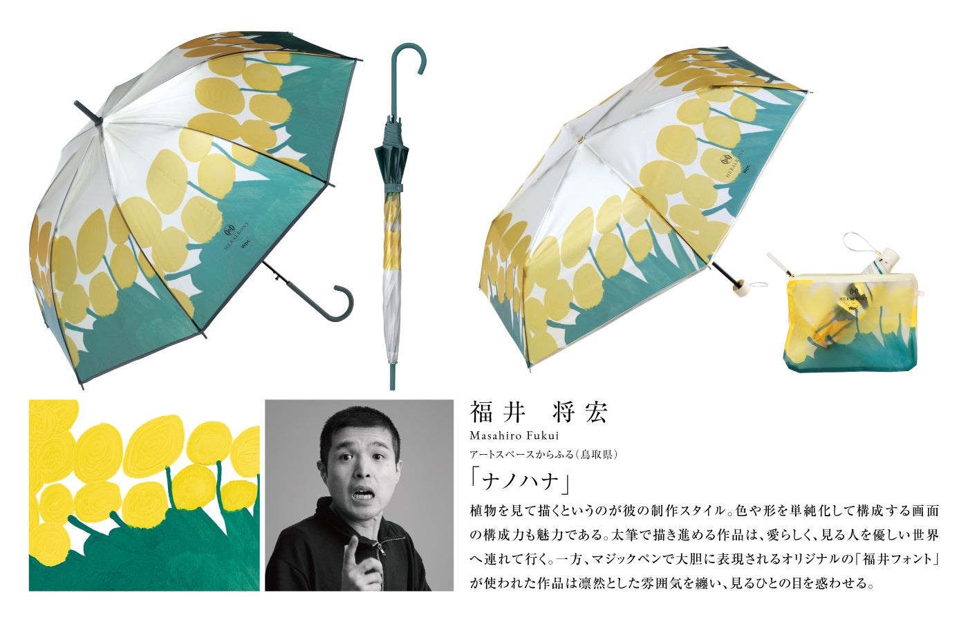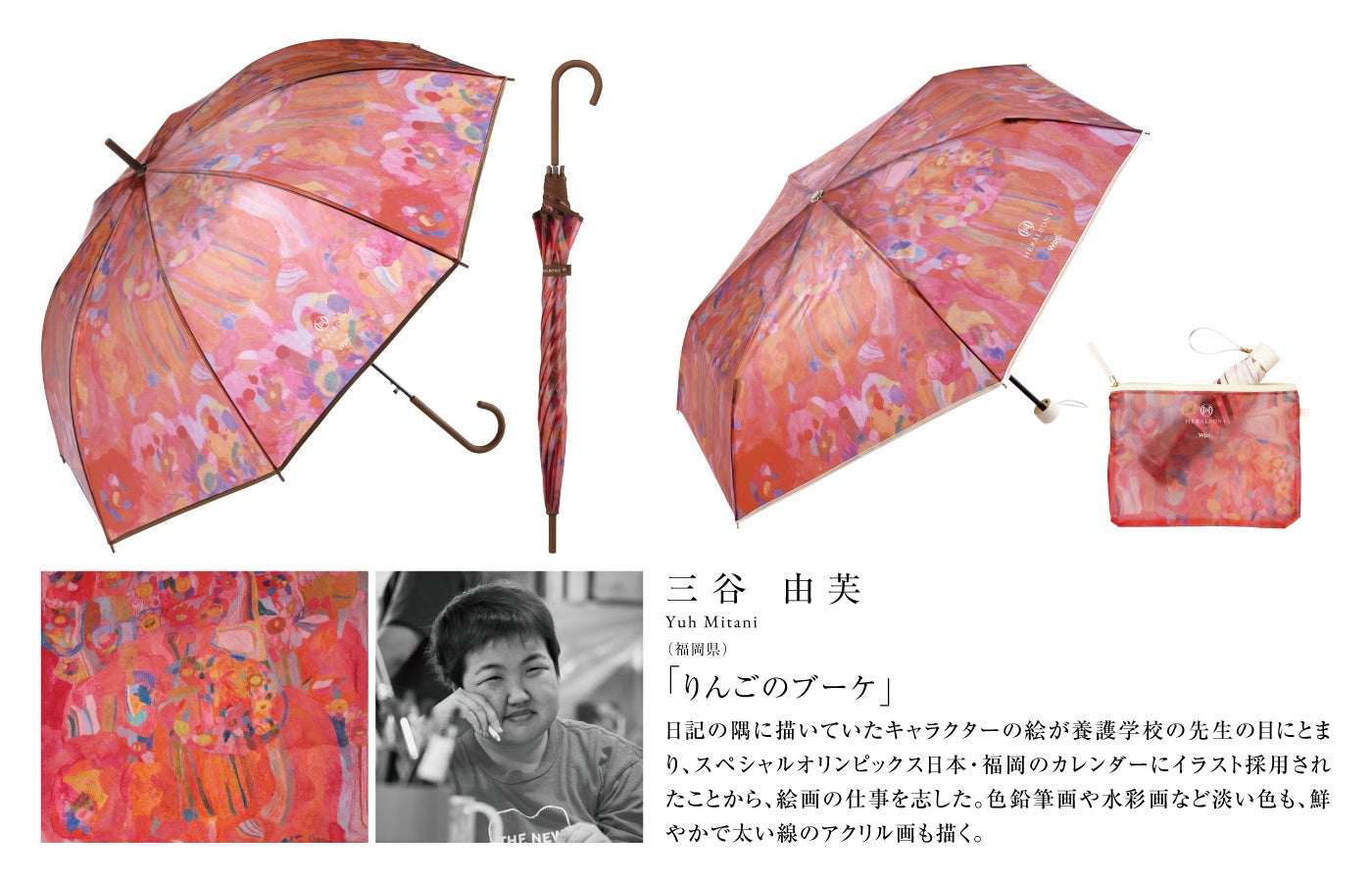 ビニール傘のデザインにはヘラルボニーの契約作家である三谷由芙氏の「りんごのブーケ」「おしゃべりなバラ」、輪島楓氏の「かえでのチョキチョキ」、福井将宏氏の「ナノハナ」、国保幸宏氏の「アサガオ」の5種を採用。傘の持ち手やパイピングの色はWpc.のデザイナーが”異彩を放つアート”に合わせてセレクトしたものです。