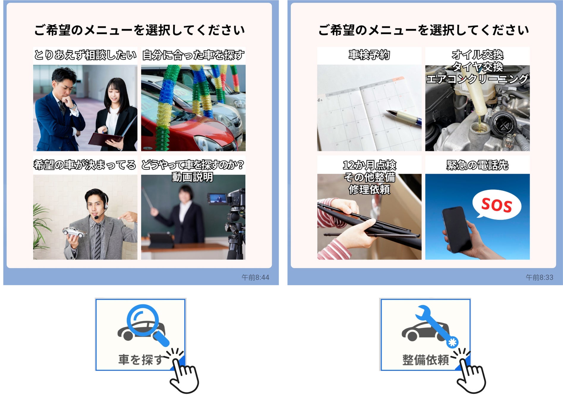 顧客の行動目的に合わせて、「車を探す」「整備依頼」といった目的別の予約ボタンを設置しました。
