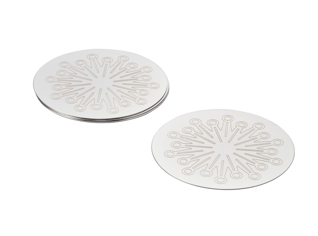 花火のようなエレガントな模様が入ったコースター4枚セットは、テーブルを華やかな雰囲気に演出します。 この商品もシンクボウルの製造時に余った耐久性のあるステンレススチールでつくられています。
