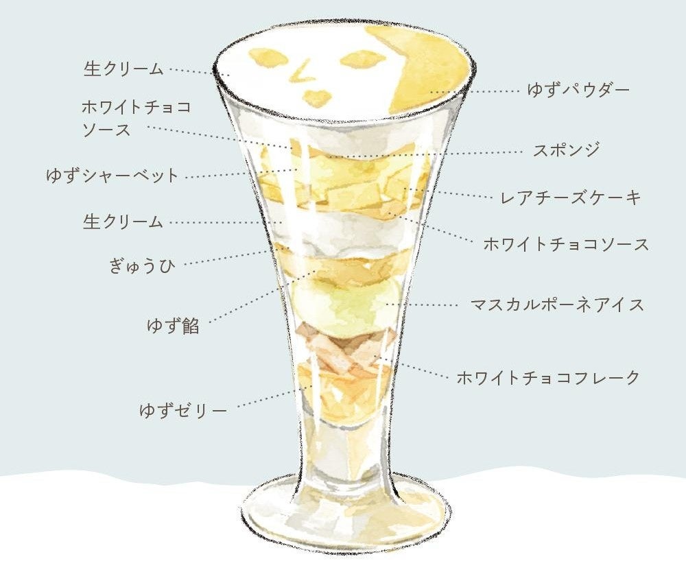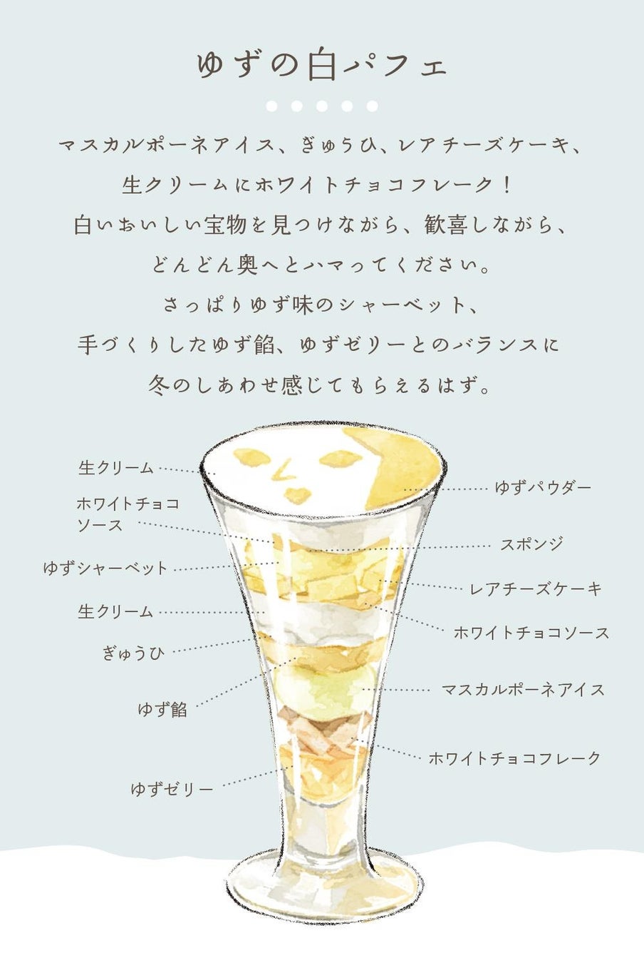 さっぱりゆず味のシャーベット、手づくりしたゆず餡、ゆずゼリーとのバランスに冬のしあわせ感じてもらえるはず。