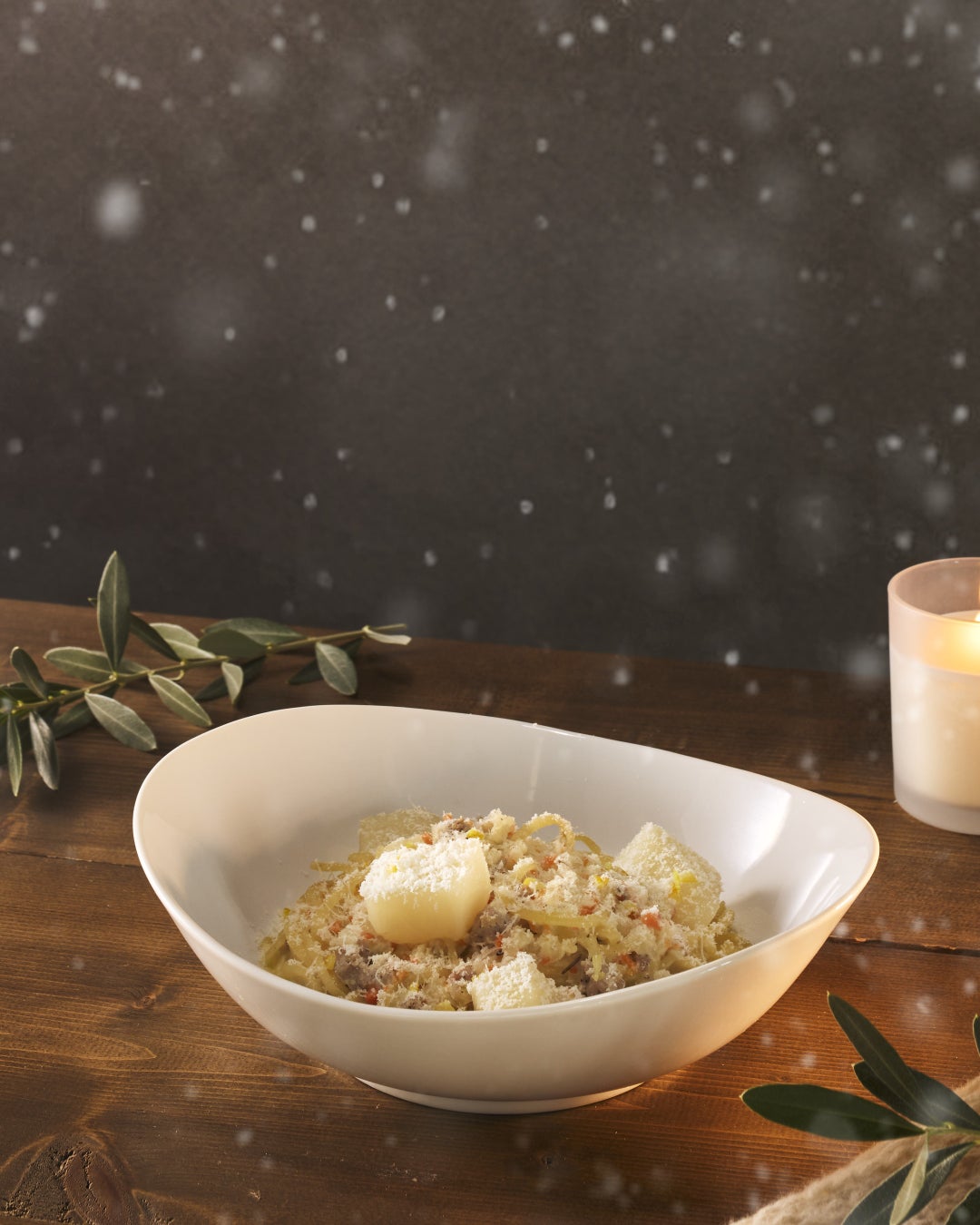もちもちリングイネに、粗挽きの豚ミンチとほんのりゆずが香るクリームソースをからめて。