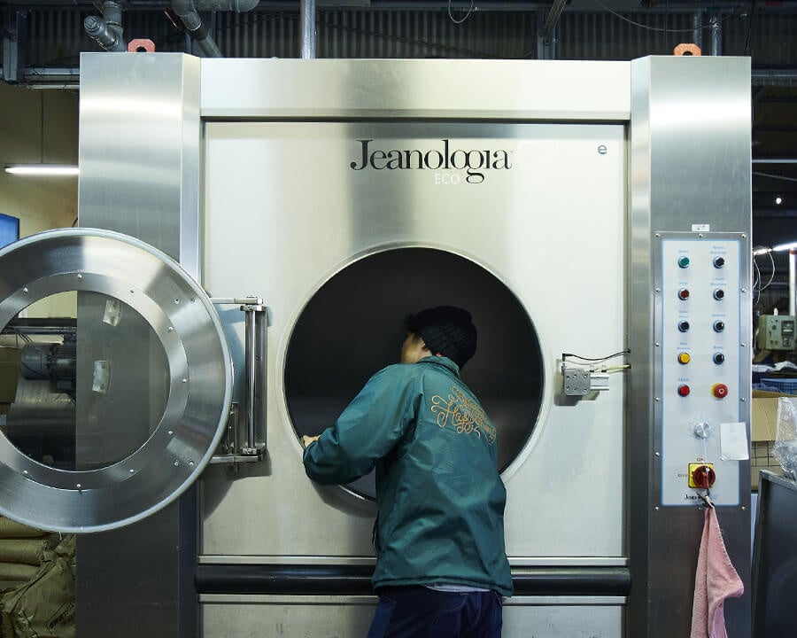 空気の力を用いた加工・オゾン脱色にて、服に負荷を与え過ぎず、廃棄水も少なく。原色感は弱まり、柔和な生地流れと素材感が際立つ表情に仕上がります。