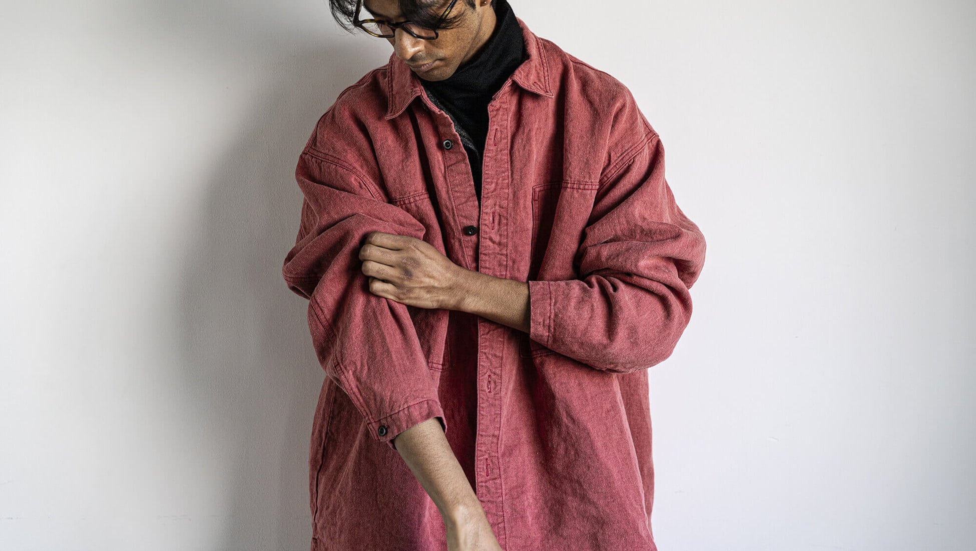 (右)FADE RED = 赤い無地のリネンデニムをオゾン脱色