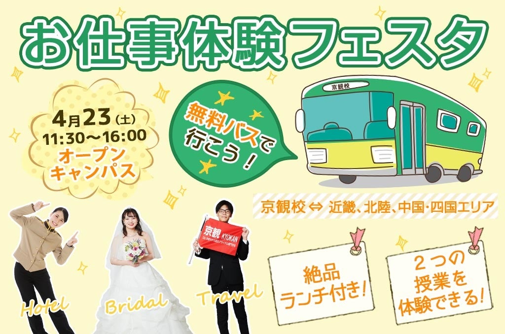 【京都ホテル観光ブライダル専門学校】4/23(土)お仕事体験フェスタを開催!ホテル・旅行・ブライダルの体験授業が受けられる。一部地域より無料バスも運行