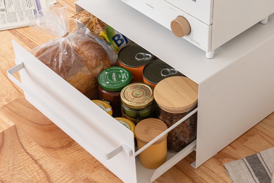 物で溢れ煩雑な印象になり、一気に生活感が出てしまいがちなキッチン。シンプルで清潔感のあるデザインの「ブレッドケース」に収納すれば、すっきり整頓&ひとまとめできて利便性も向上。