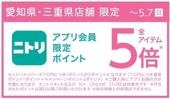 5月7日(日)までの協賛セール期間中、ニトリアプリをお持ちのお客様限定で、お買い上げ110円ごとに通常1ポイントのところ5ポイント付与となる「アプリ会員ポイント5倍サービス」を実施いたします。付与されたポイントは、1ポイント1円として翌日からN+をはじめ、ニトリグループの各店でご利用いただけます。