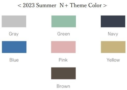 カラーコーディネートを基本とする、N+のこの夏の基本色は7色。ややグレイッシュな人気のトーンで、夏に映えるブルーは、濃淡の2色をご用意しています。
