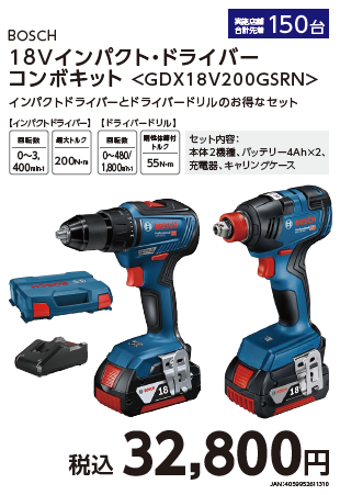 商品名:ボッシュ 18Vインパクト・ドライバーコンボキット<GDX18V200GSRN>