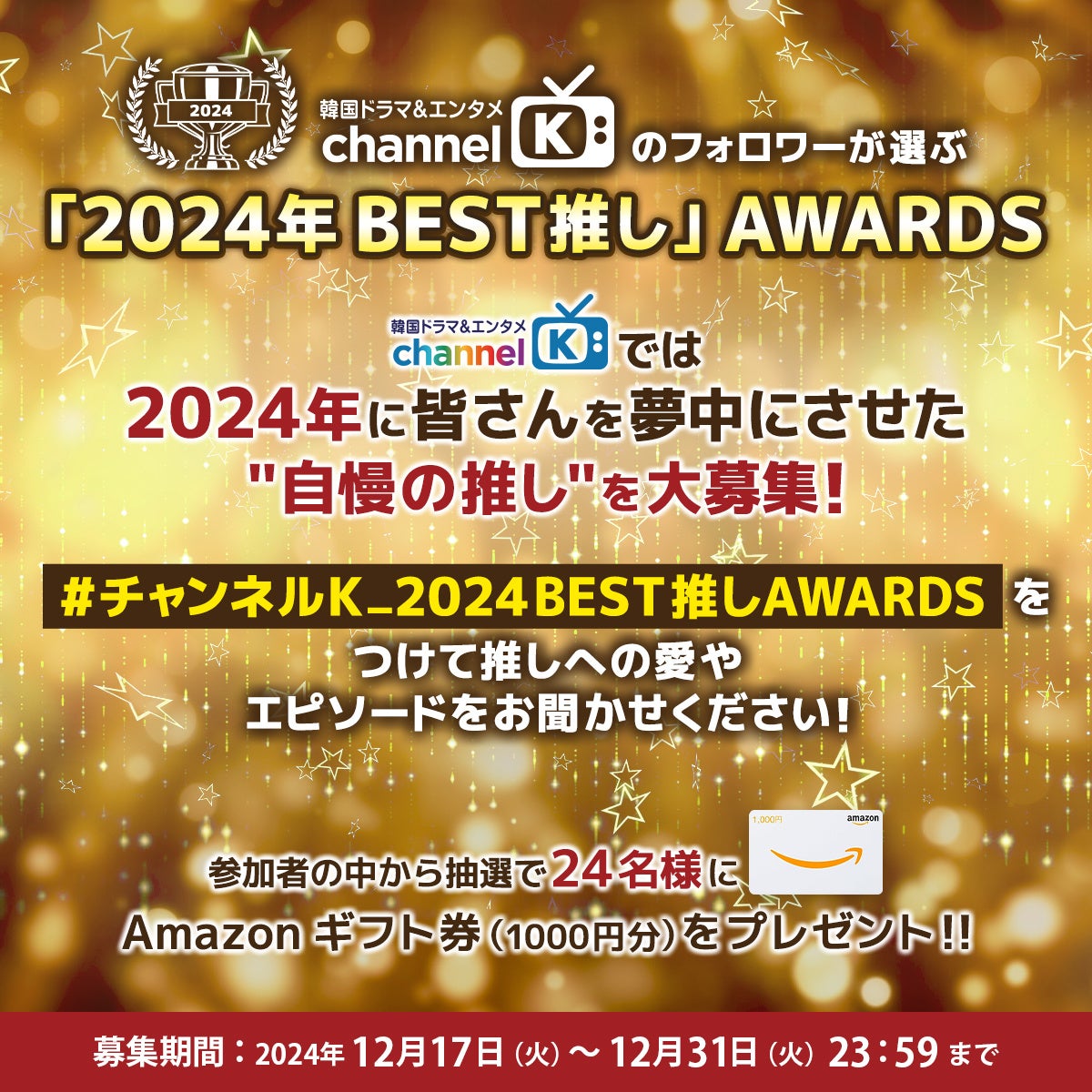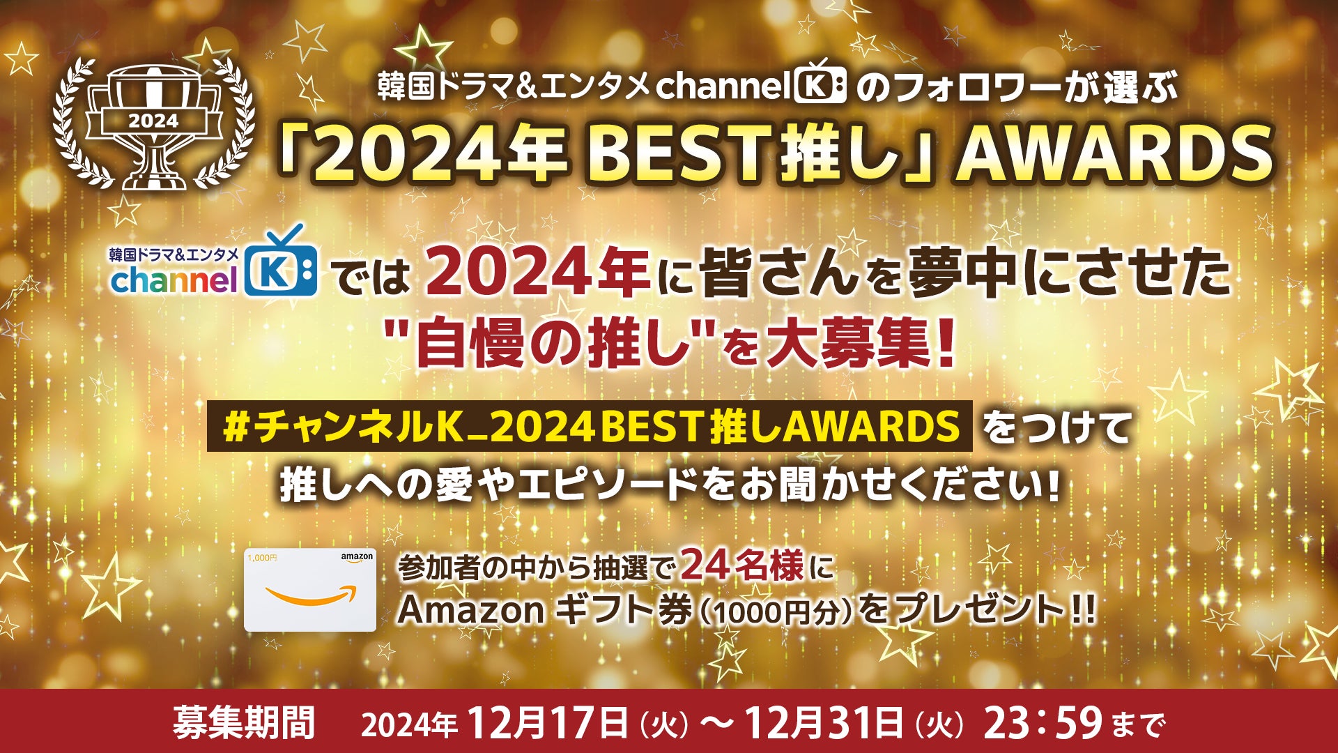 本イベントは、「チャンネルK」公式Xのフォロワーを対象にしたもので “自慢の推し” (韓流・華流俳優、アイドル)の名前と指定のハッシュタグ“#チャンネルK_2024BEST推しAWARDS”をつけて投稿するだけでどなたでも簡単にご参加いただけます。