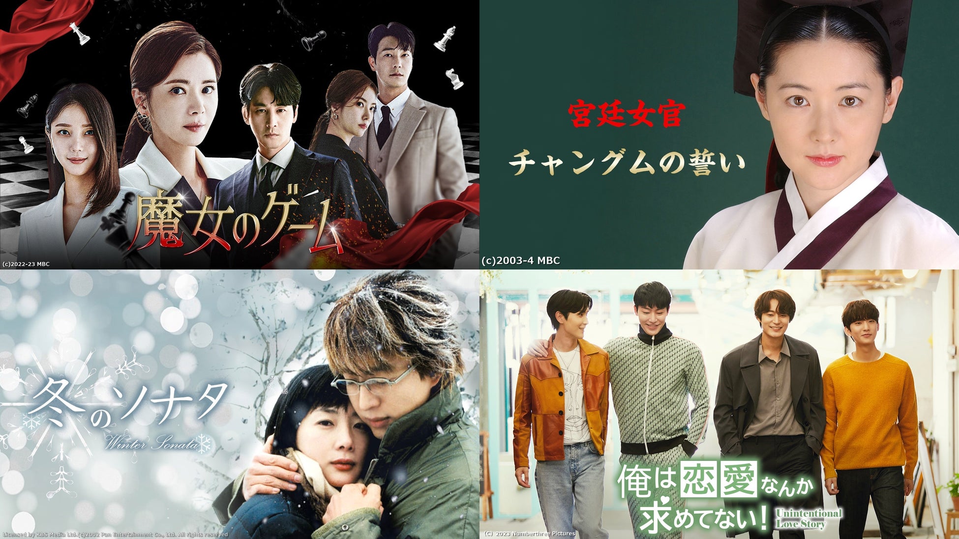 現在BS11にて大好評配信中、欲と権力によって人生を破壊された女性達による究極の復讐劇「魔女のゲーム」(2022)の見逃し配信をはじめ、韓国時代劇の金字塔ともいえる「宮廷女官チャングムの誓い」(2003)、主演2人の切ない恋心を描いたストーリーはもちろん、数々の名言が生み出されたことでも話題となった韓流ブームの火付け役「冬のソナタ」(2002)など、チャンネルKには話題作から誰もが知る不朽の名作まで勢ぞろい。