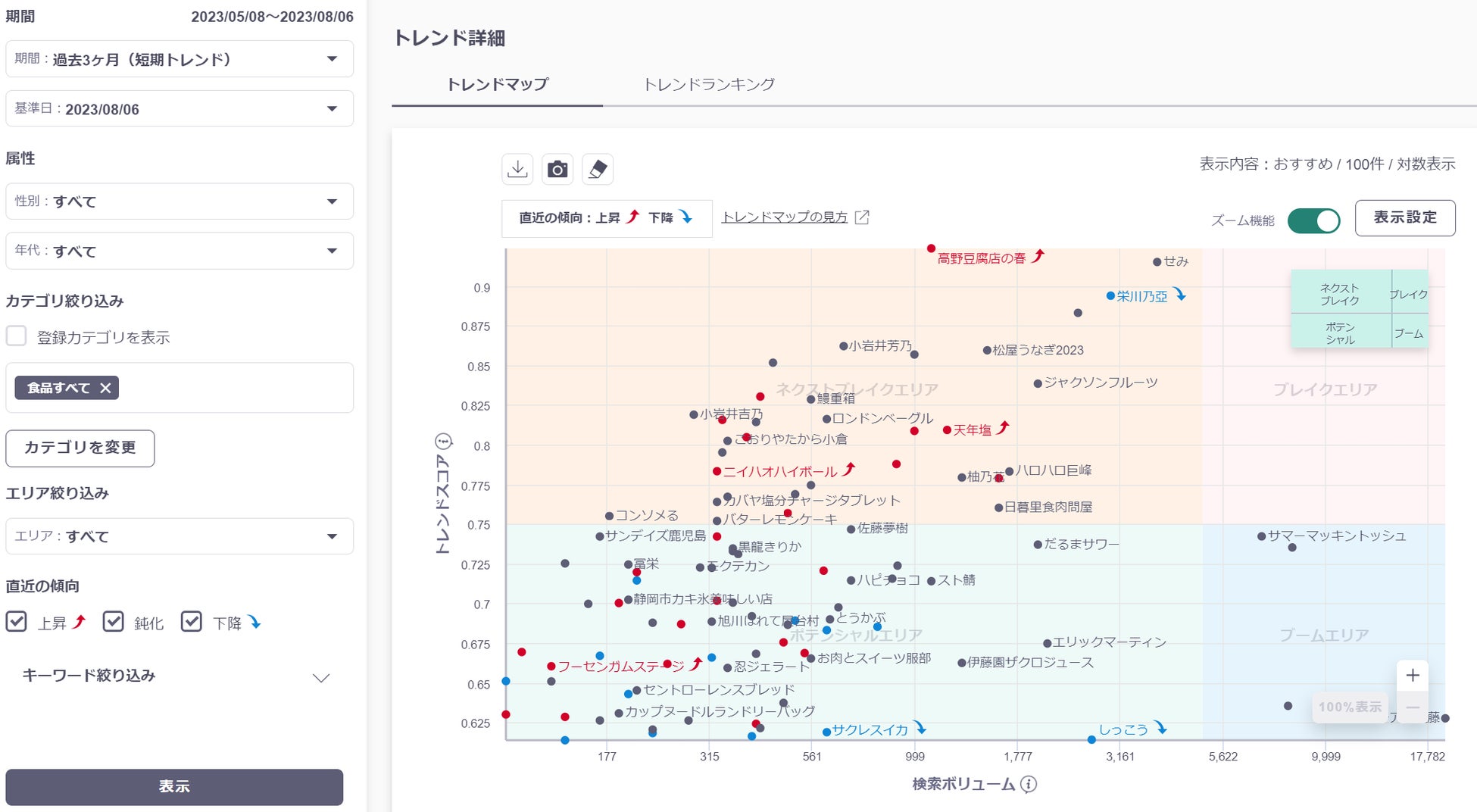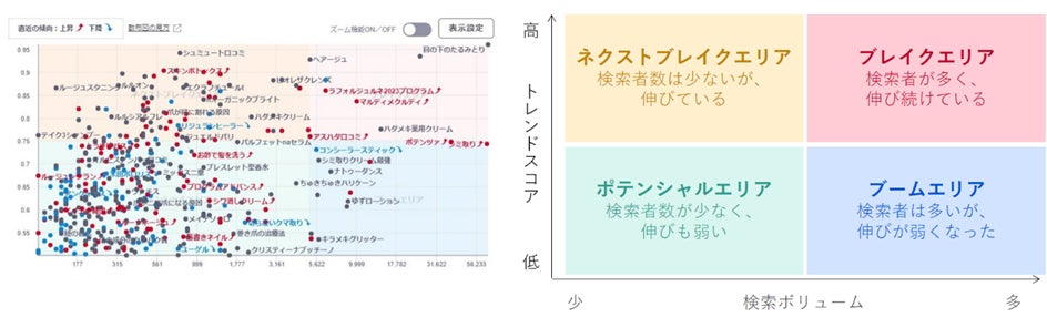 横軸に検索ボリューム(※4)、縦軸にトレンドスコア(※5)をとり、散布図形式で検索キーワードを可視化し、それぞれのキーワードが4つのライフサイクル(ネクストブレイクエリア、ブレイクエリア、ポテンシャルエリア、ブームエリア)のどの位置にいるのか確認できます。また、性年代の属性別、カテゴリ別、期間別(3カ月間または1年間)で可視化できます。