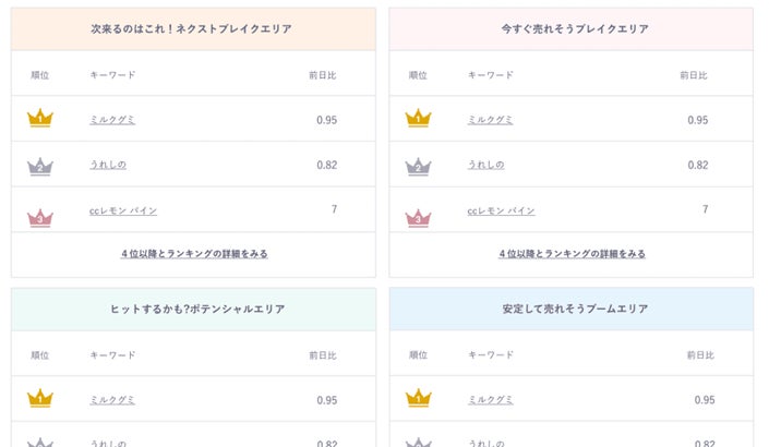 トレンドマップの散布図のエリアごとに、キーワードランキングを表示します。ランキングに表示されたキーワード別に、トレンドスコア、推定検索人数、属性割合、年代別割合などを確認できます。