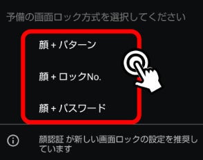 Step4:予備の画面ロック方式で選んだパターン、ロックNo.またはパスワードを設定した後、顔を登録します。画面の指示に沿って登録してください。