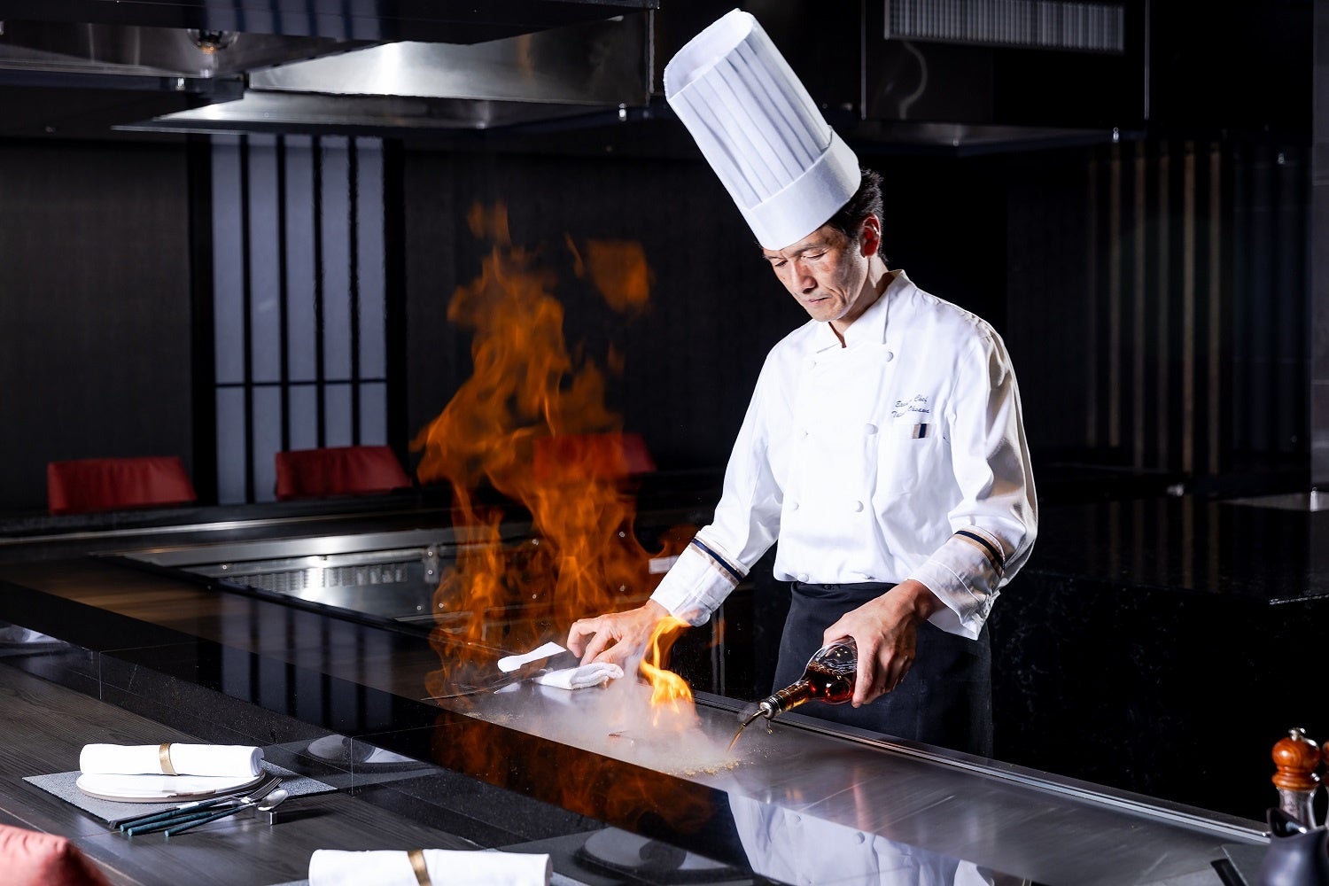 厳選したお肉や旬の海産物を盛り込んだグリルコースをお召し上がりいただけます。中央の鉄板焼きカウンターをメインにテーブル席もございます。明星ヶ岳と大文字の美景を眺める窓際席もおすすめです。また、食材の持ち味を存分に生かした調理をライブ感たっぷりに味わえるのも魅力です。