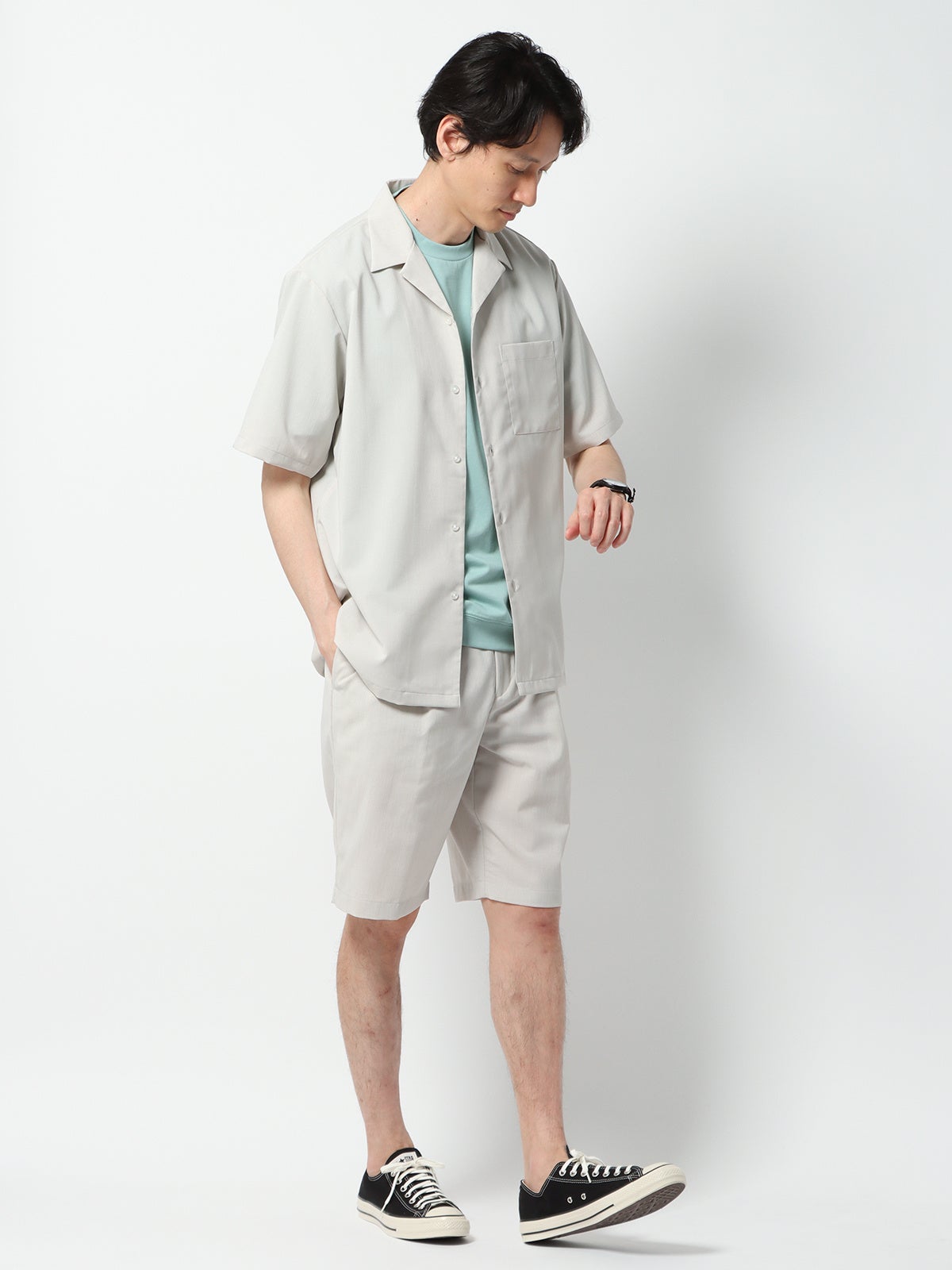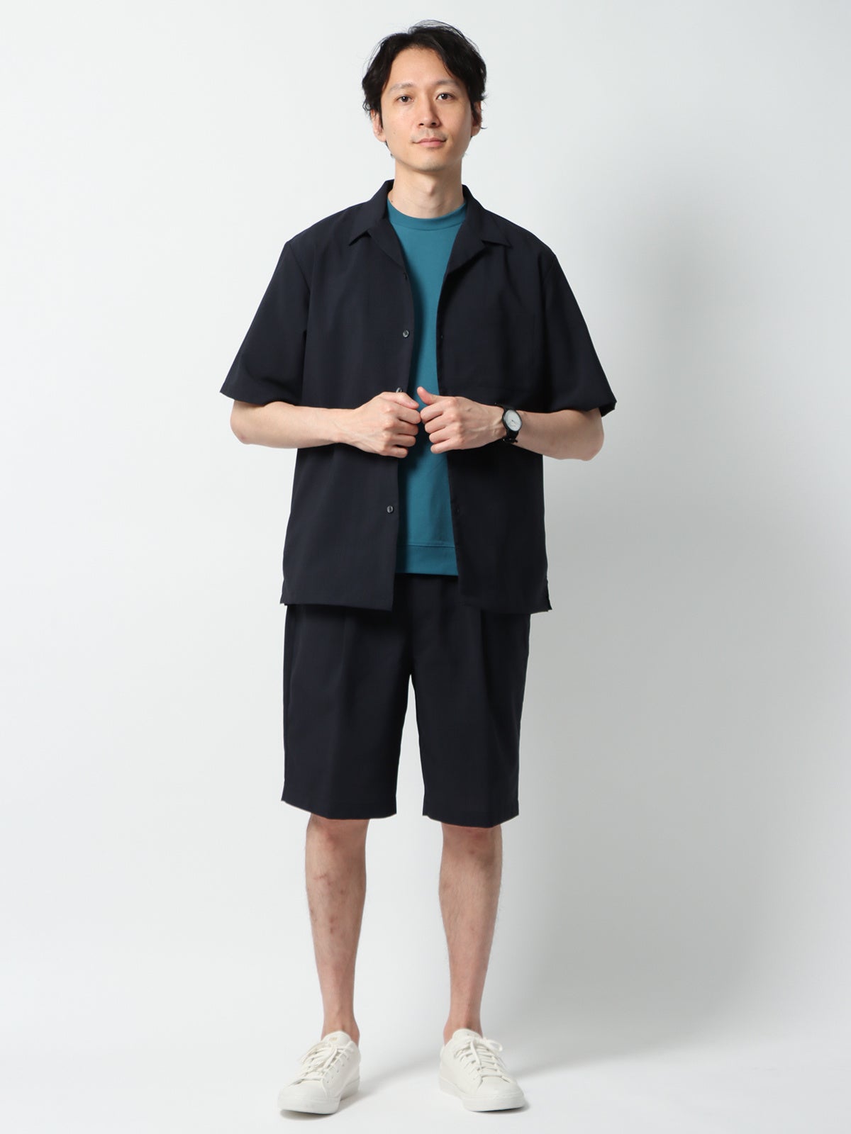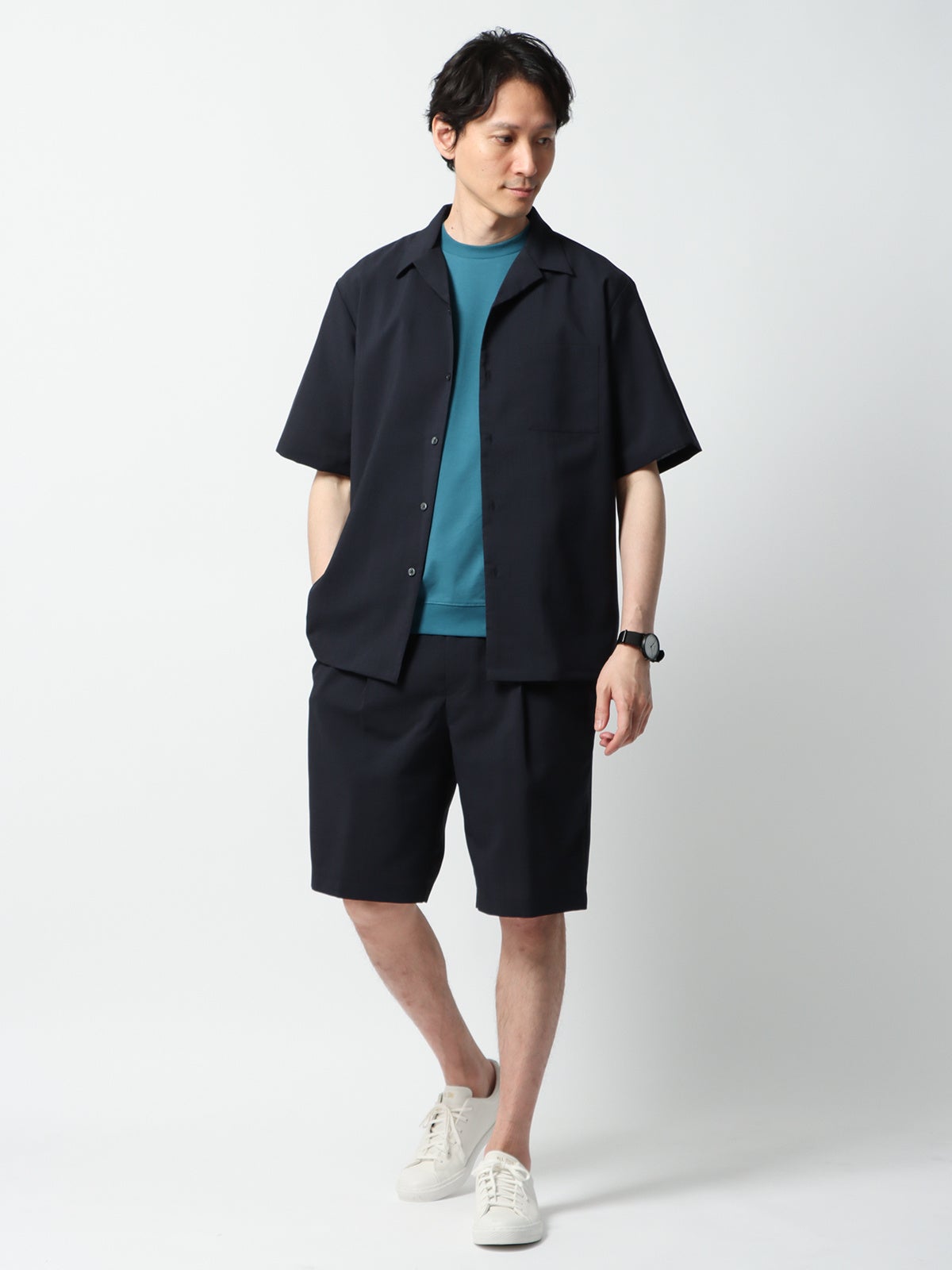 オフィパックは、同じ生地で長袖シャツ・半袖シャツ・半袖Tシャツ・イージーパンツも用意しており、カセット服として着用できます。メンズスタイルのカセット服は、スーツのようにきれいなパンツや、ドローコード付きのようにリラックスしたパンツなど、丈が長いデザインが多く企画されています。そのような中でも「オフィパック」は、ビジネス向けのハーフパンツを取り入れた、メンズスタイルでは珍しいカセット服となっています。上下合わせた際のバランスにもこだわっており、色違いでの組み合わせもきれいにまとまるため、オフィスカジュアルから休日スタイルまで、「オフィパック」シリーズで着回しコーディネートが可能な企画となっています。