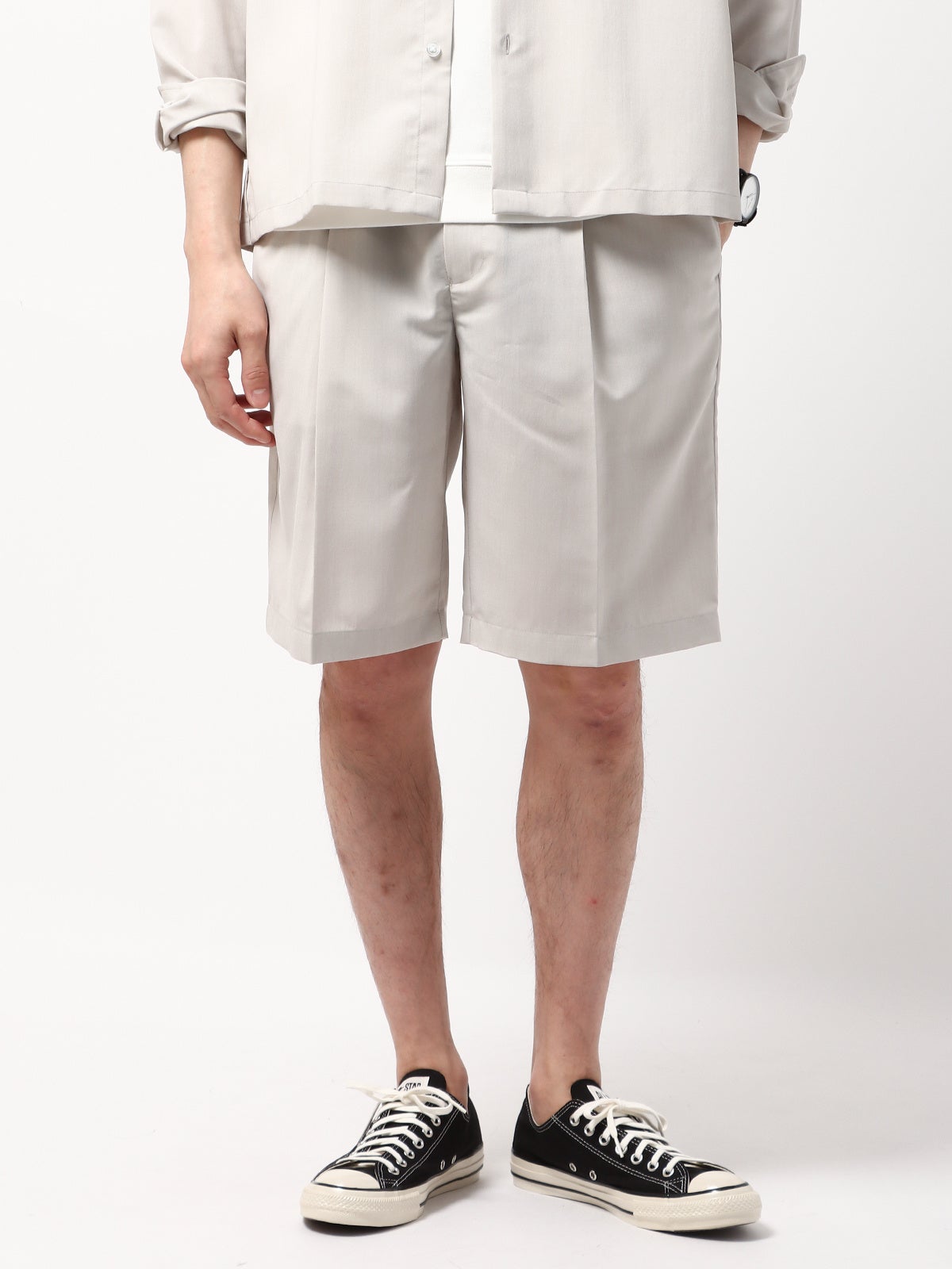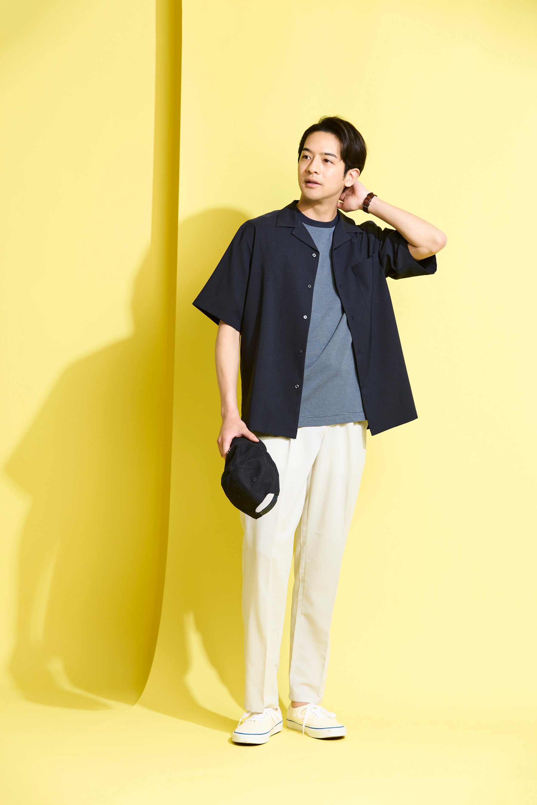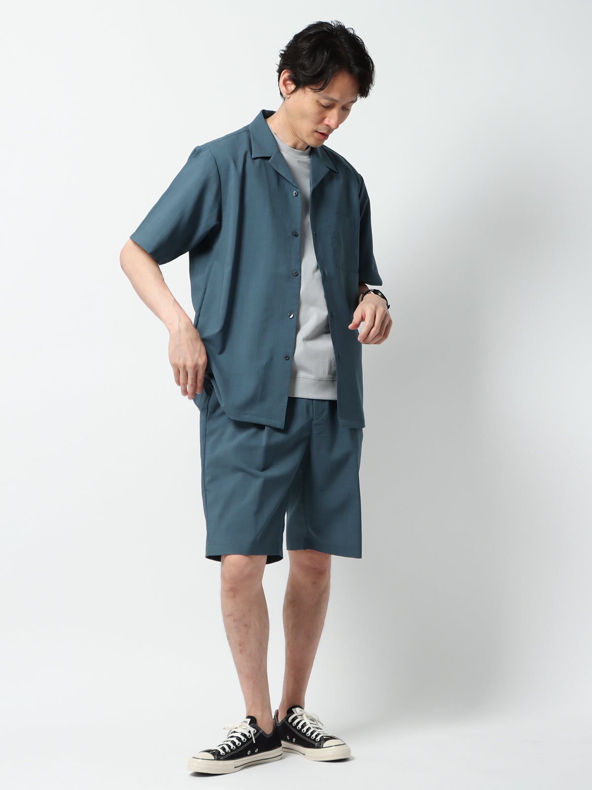 オフィパックは、同じ生地で長袖シャツ・半袖シャツ・半袖Tシャツ・イージーパンツも用意しており、カセット服として着用できます。メンズスタイルのカセット服は、スーツのようにきれいなパンツや、ドローコード付きのようにリラックスしたパンツなど、丈が長いデザインが多く企画されています。そのような中でも「オフィパック」は、ビジネス向けのハーフパンツを取り入れた、メンズスタイルでは珍しいカセット服となっています。上下合わせた際のバランスにもこだわっており、色違いでの組み合わせもきれいにまとまるため、オフィスカジュアルから休日スタイルまで、「オフィパック」シリーズで着回しコーディネートが可能な企画となっています。