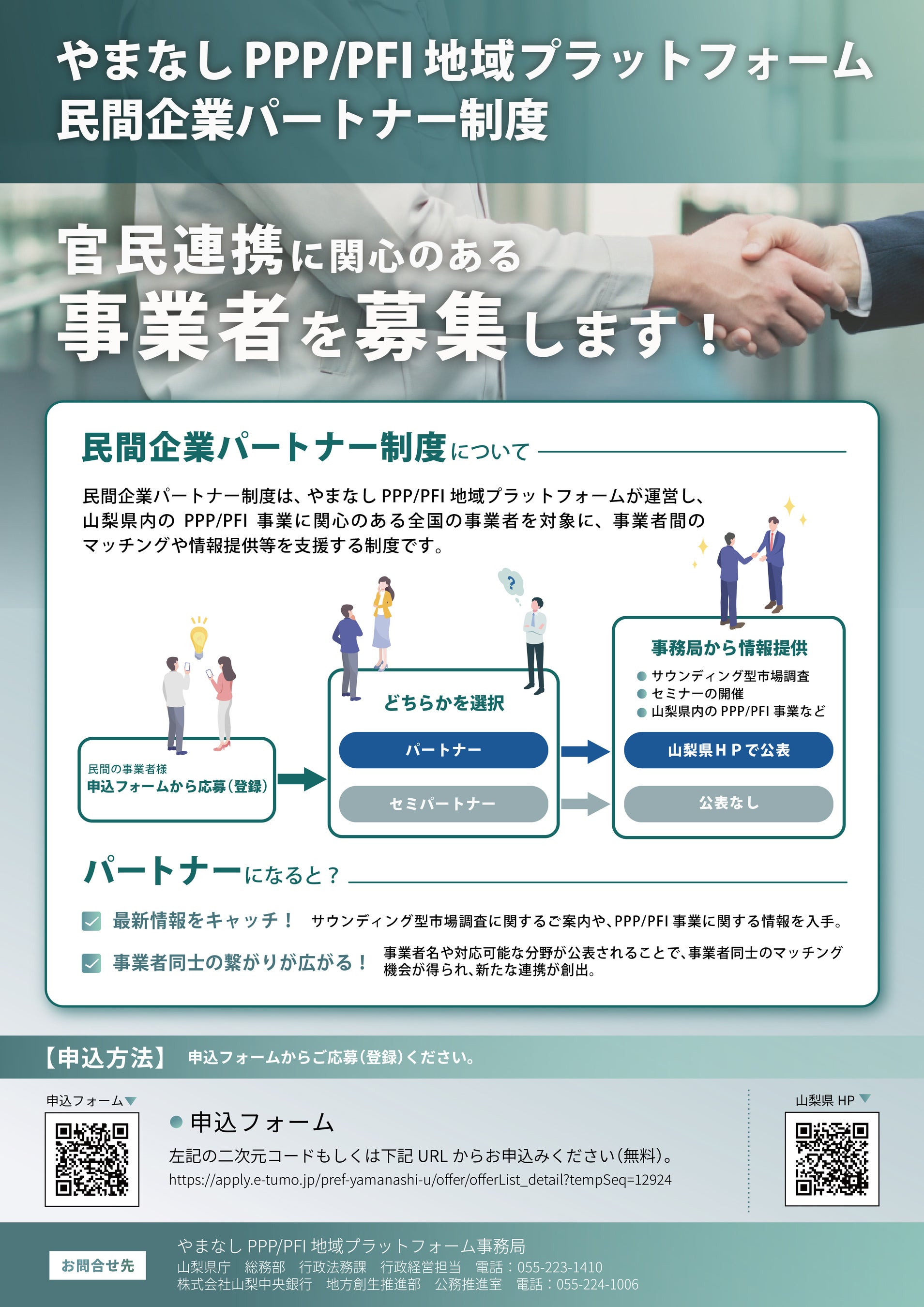 やまなしPPP/PFI地域プラットフォーム「民間企業パートナー制度」への参画事業者を募集します