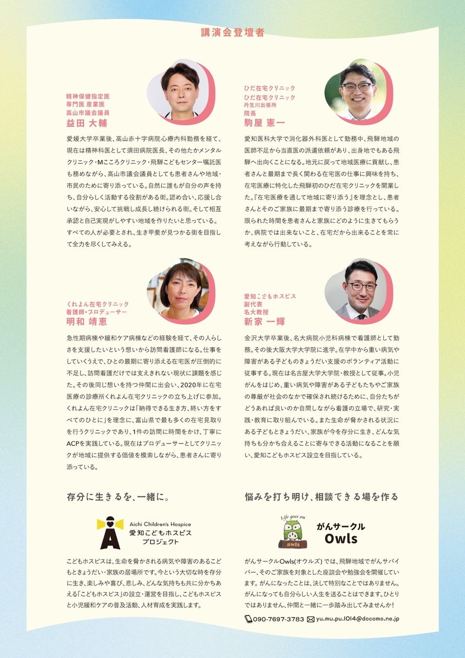 病気になった人だけが寄り添える地域や社会ではなく、すべての人がその人らしく生きられるように。自分や大切な人のいのちについて考えるきっかけになってほしいと願い、企画された講演会です。