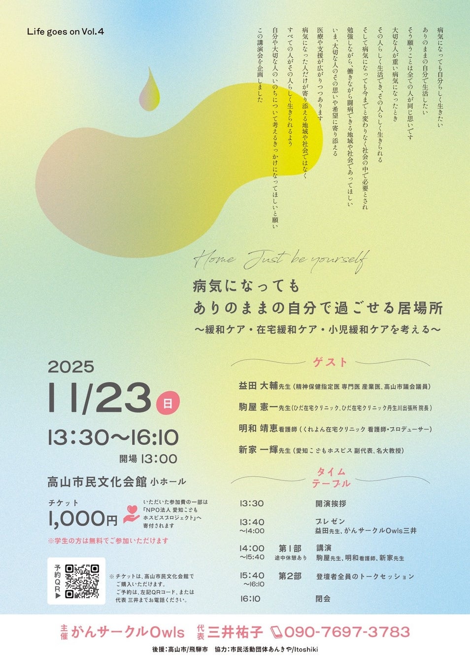 令和7年11月23日(日・祝)に、自身もがんサバイバーである三井祐子さんが代表を務める「がんサークルOwls(オウルズ)」が、自分や大切な人のいのちについて考えるきっかけになってほしいと願い「病気になってもありのままの自分で過ごせる居場所 ~緩和ケア・在宅ケア・小児緩和ケアを考える~」を開催します。