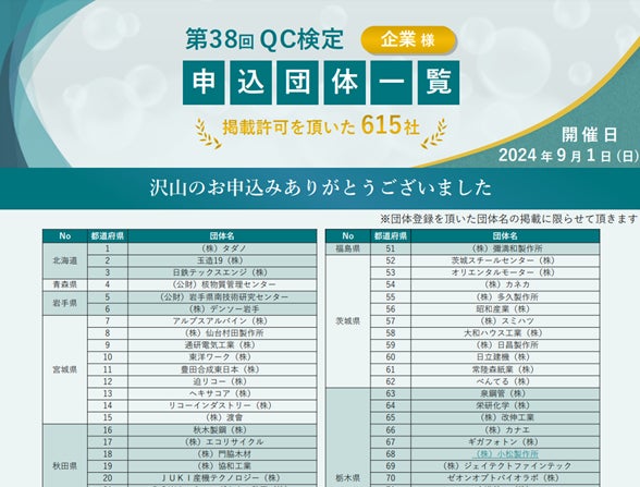 どのような組織がQC検定に取り組んでいるのかをご紹介いたします。下記URLに、前回の検定(第38回QC検定:2024年9月1日実施)を団体申込で受検された企業・団体・学校のうち、名称公表の承諾をいただいた組織の一覧を掲載しています。ぜひご覧ください。