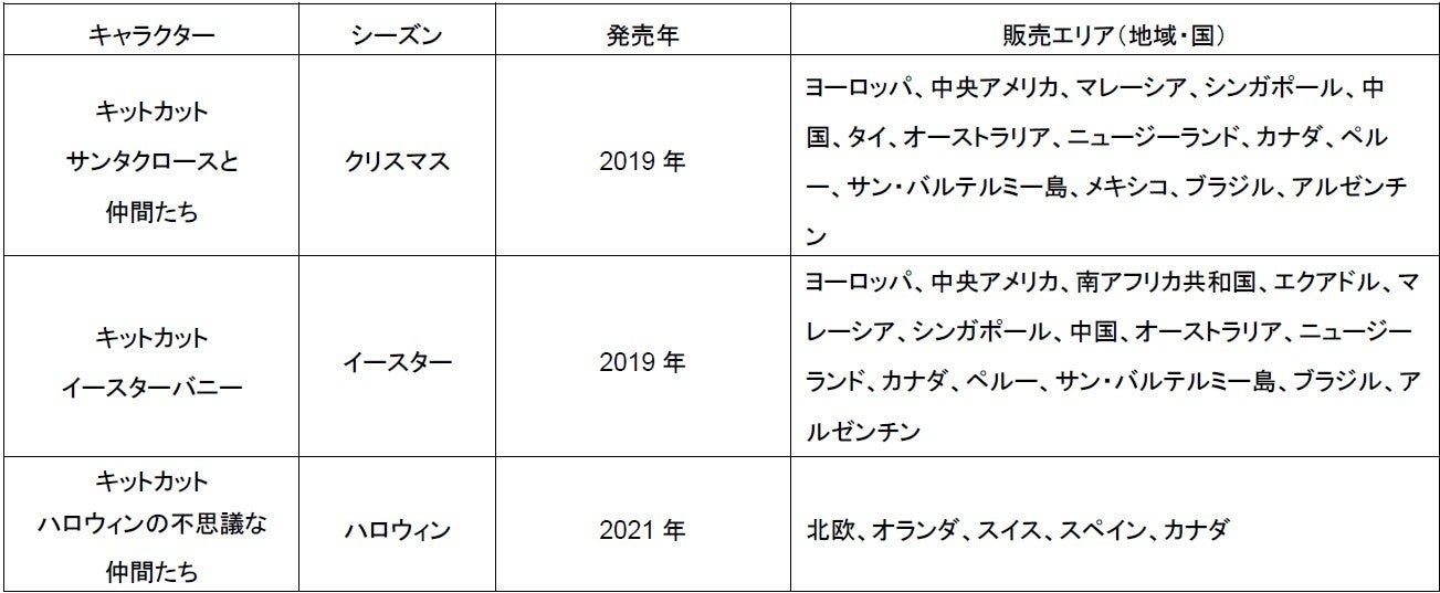 世界ではこれまでに以下のようなキャラクター型「キットカット」が展開されています。