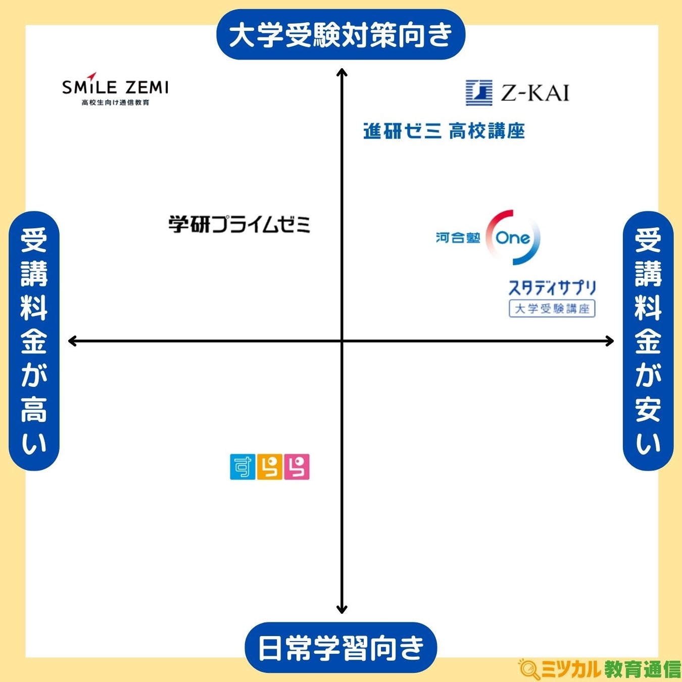そこで、少しでもお子様の通信教育選びをサポートできるよう、「ミツカル教育通信」は『高校生向け通信教育 ポジショニングマップ』を作成しました。