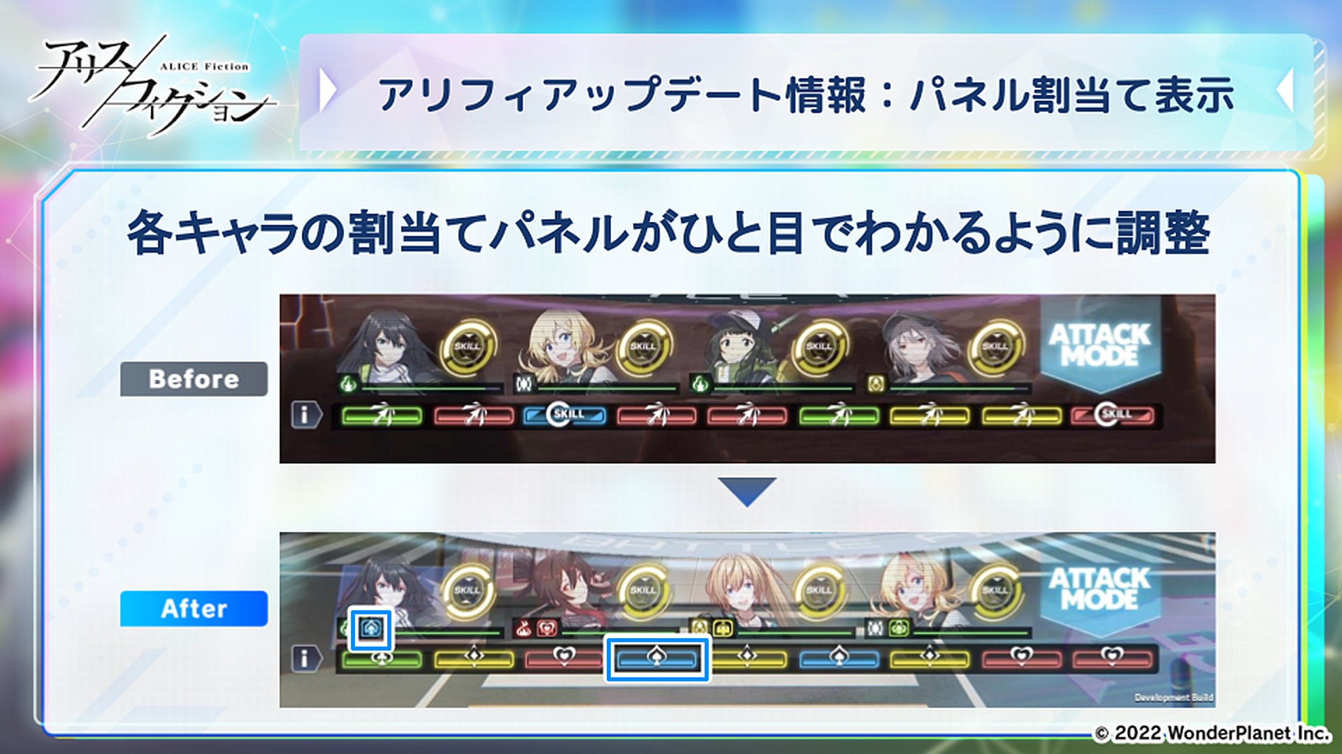 今回のアップデートでは、各キャラの割り当てパネルがひと目でわかるように調整しました。また、最大4人パーティ、3ターン制に調整し、バトルアリーナを遊びやすく変更しました。