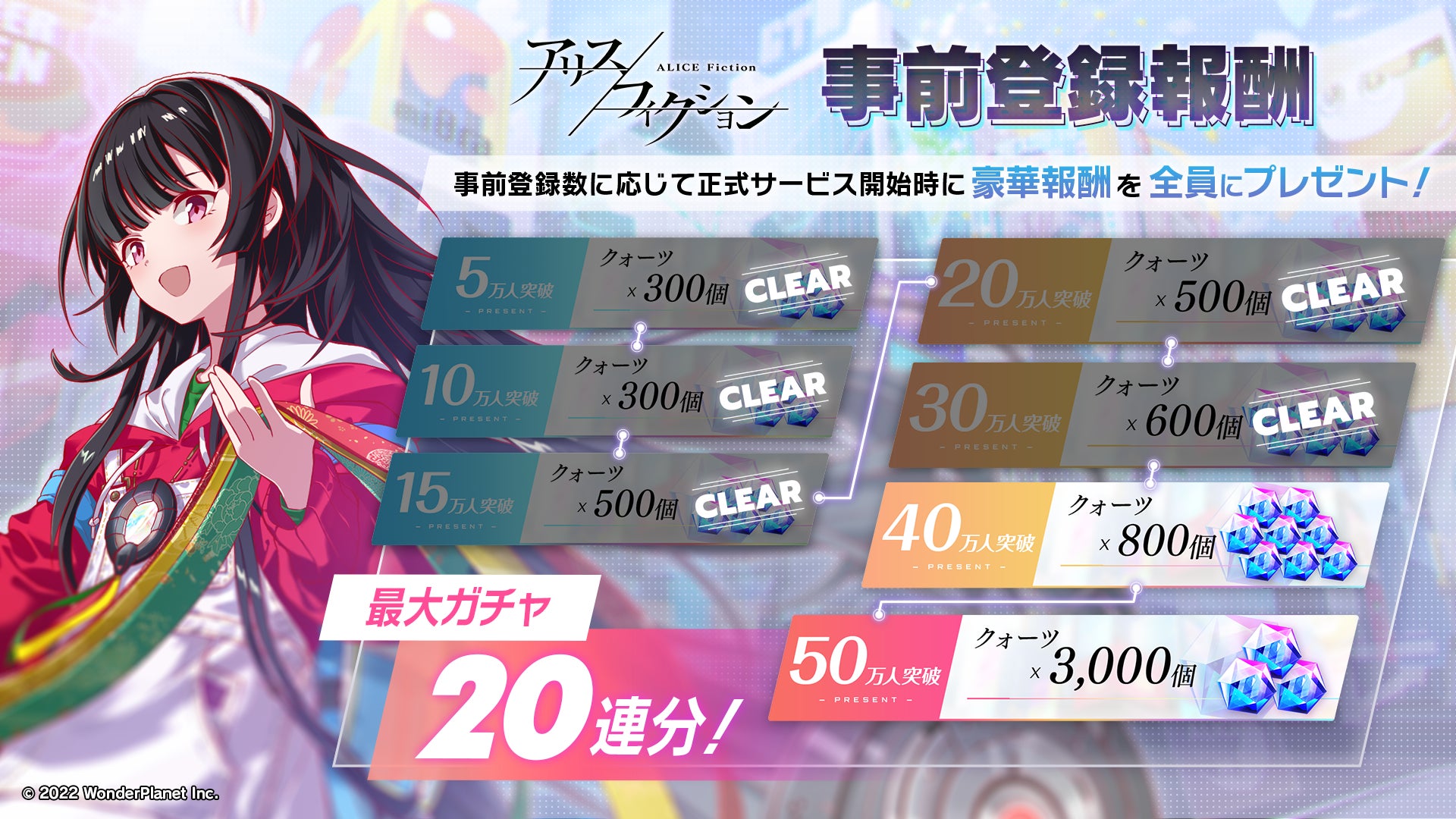 引き続き、『アリスフィクション』では、事前登録いただいた人数に応じて、正式リリース後に最大でガチャ20連分相当のクォーツを、全員にプレゼントいたします。サービス開始を楽しみにお待ちください。