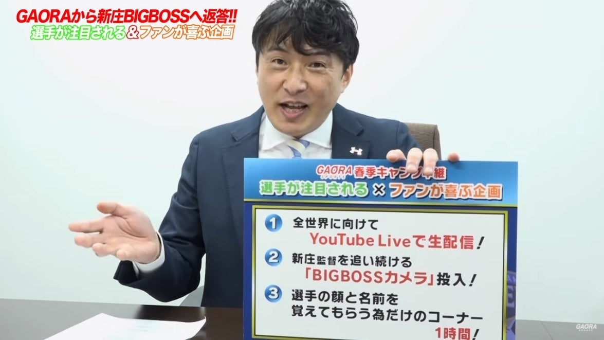 北海道日本ハムファイターズをトコトンお届けし続けているGAORA SPORTSは、“BIGBOSS”新庄剛志新監督からの要望に応えるべく、2月1日から連日生中継する「ファイターズキャンプLIVE2022 ~GAORAも暴れまっせ!~」の中で登場させる新企画を公式YouTubeチャンネル(https://youtu.be/GmlPJNqs5SE)で発表しました。