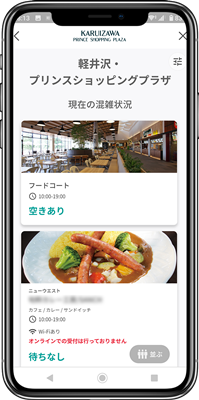施設内の各レストラン(一部店舗除く)・フードコートの混雑状況がアプリから確認できるようになります。レストランの順番待ちシステムを導入しており、待ち時間のさらなる有効活用が可能になります。