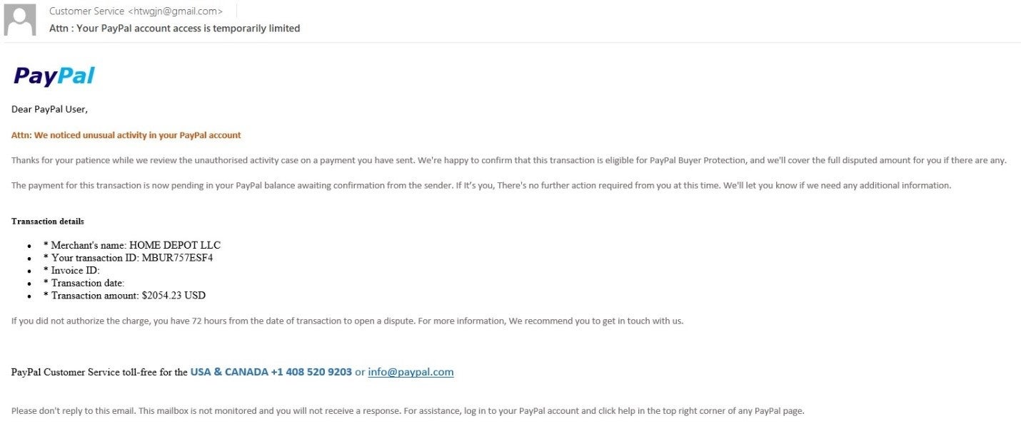 ビッシング(ボイス:Voiceとフィッシング:Phishingを掛け合わせた言葉)とは、個人を狙ってサイバー犯罪者宛てに電話をかけさせ、個人や銀行口座の情報などを聞き出す詐欺行為です。この手口は多くのフィッシング詐欺と同様に、大手のオンラインストアや決済システムから通常とは異なるメールが送られてくることから始まります。例えば、偽のPayPalから「あなたの口座から多額のお金を引き落とす請求があった」といった内容です。