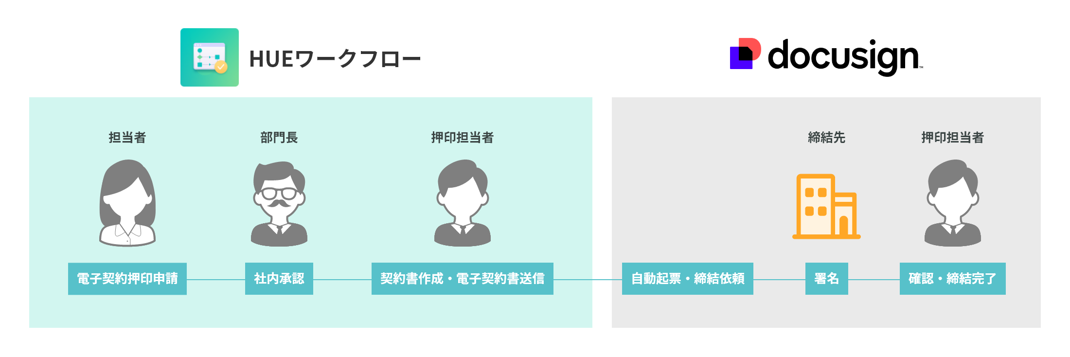 今回の連携により、「HUEワークフロー」上で社内承認された契約書はワンクリックで「DocuSign」のプラットフォームに遷移し、相手方への契約書送信・締結・返送・保管までをシームレスに完結。社内承認や契約書締結完了までの時間を削減します。