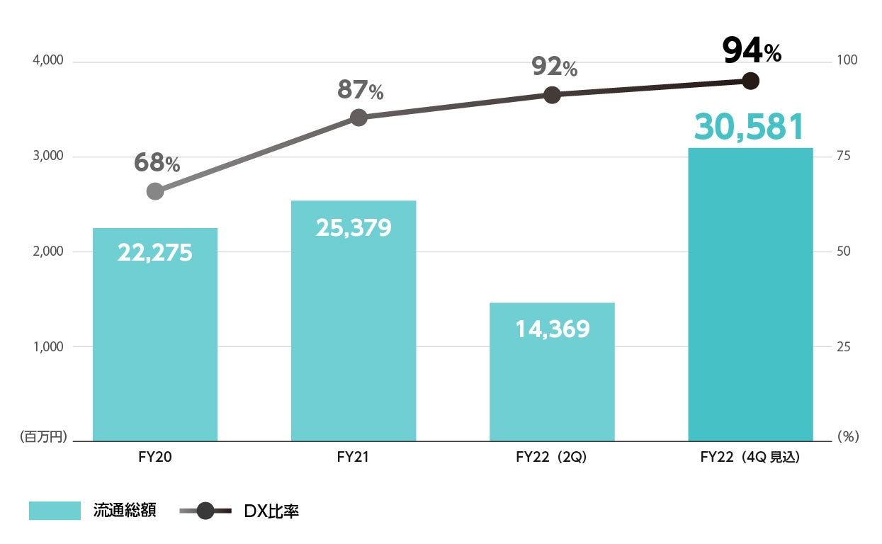 虎の穴2021年度上半期(2021年7月~2021年12月)につきましては、コロナ禍による「緊急事態宣言」と「まん延防止等重点措置」が長く続き、多くの同人イベントが中止や延期など縮小せざるを得ない中、弊社では2020年期より推進しているSEO対策やECサイトのシステム改修などに加え、即売会イベントのWEB化支援等まで含むDX戦略が成果を挙げ、流通総額は過去最高の143億8,000万円(前年同期比126%)を達成。特にとらのあなECサイト+ファンティアを合算したDX事業の2021年度上半期の流通総額は132億円と全体の90%超を占め、サービス全体の総会員数は1,002万人(前年同期比146%)へ至るまでに成長をしました。