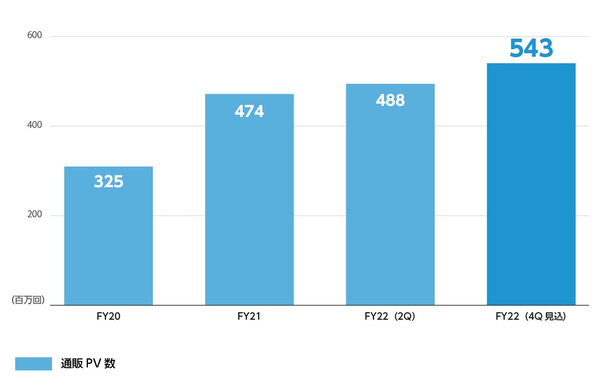 →2021年度上半期の流通事業は、新型コロナウイルス蔓延防止のためのイベントの延期・縮小などの影響を受けたことで、店舗から通販への構造転換を大胆に進め、加えて女性向け流通支援を最大化したことで、売上は前年同期比104%を達成。また、ECサイト利用者と海外ユーザーが急速に増え、同人流通事業の会員数は360万人(前年同期比108%)を超えました。