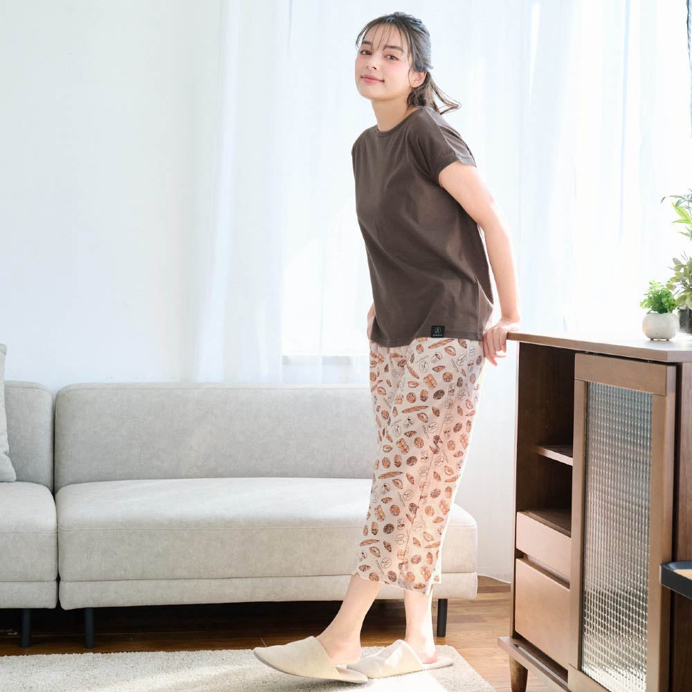 トップスとボトムスのセットで、身生地には肌ざわりの良い綿100%の天竺素材を使用しています。ボトムスには見ると楽しくなるメゾンカイザーのパンのイラストを、トップスの裾にはブランドロゴをあしらいました。首まわりがすっきり見えるネックラインに加え、ボトムスの両サイドにはポケットを配置し、ウエストをゴム仕様にするなど、快適な着用感を追求しました。ちょっとした外出や急な来客にも対応できるルームウェア感覚のパジャマです。