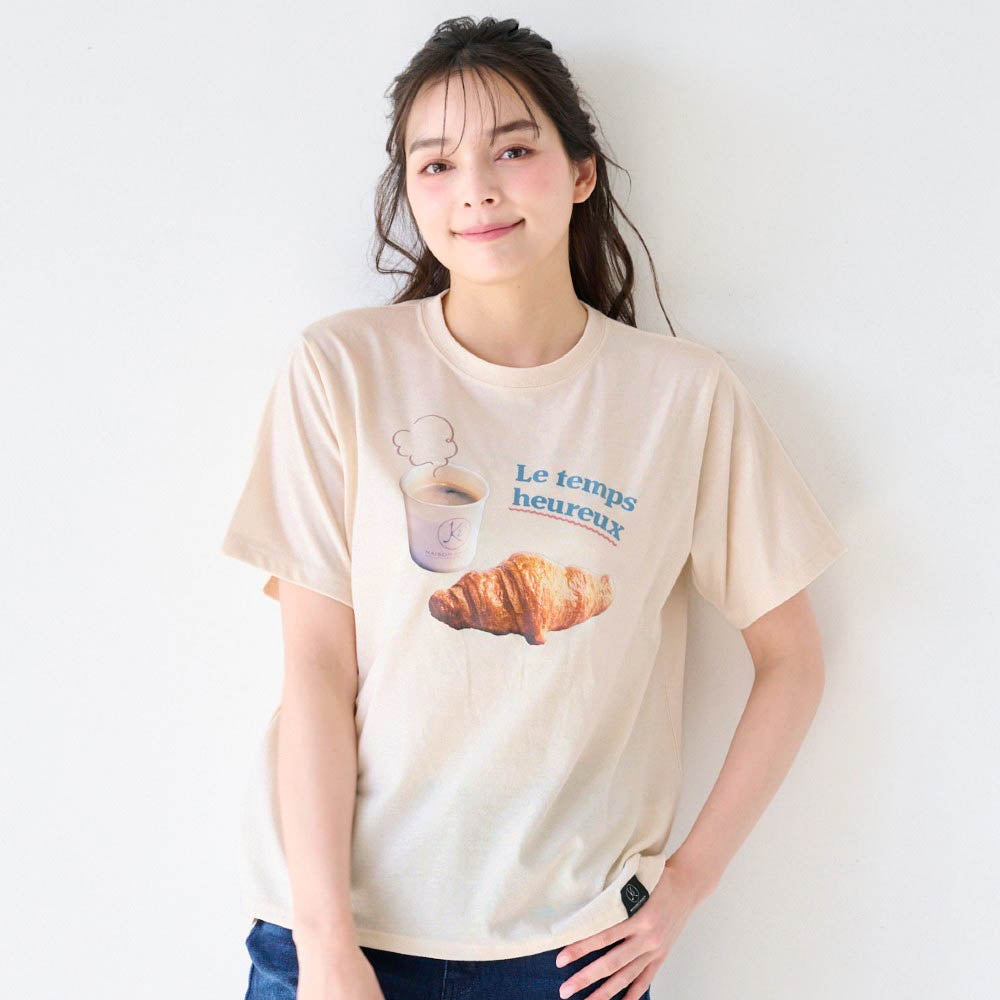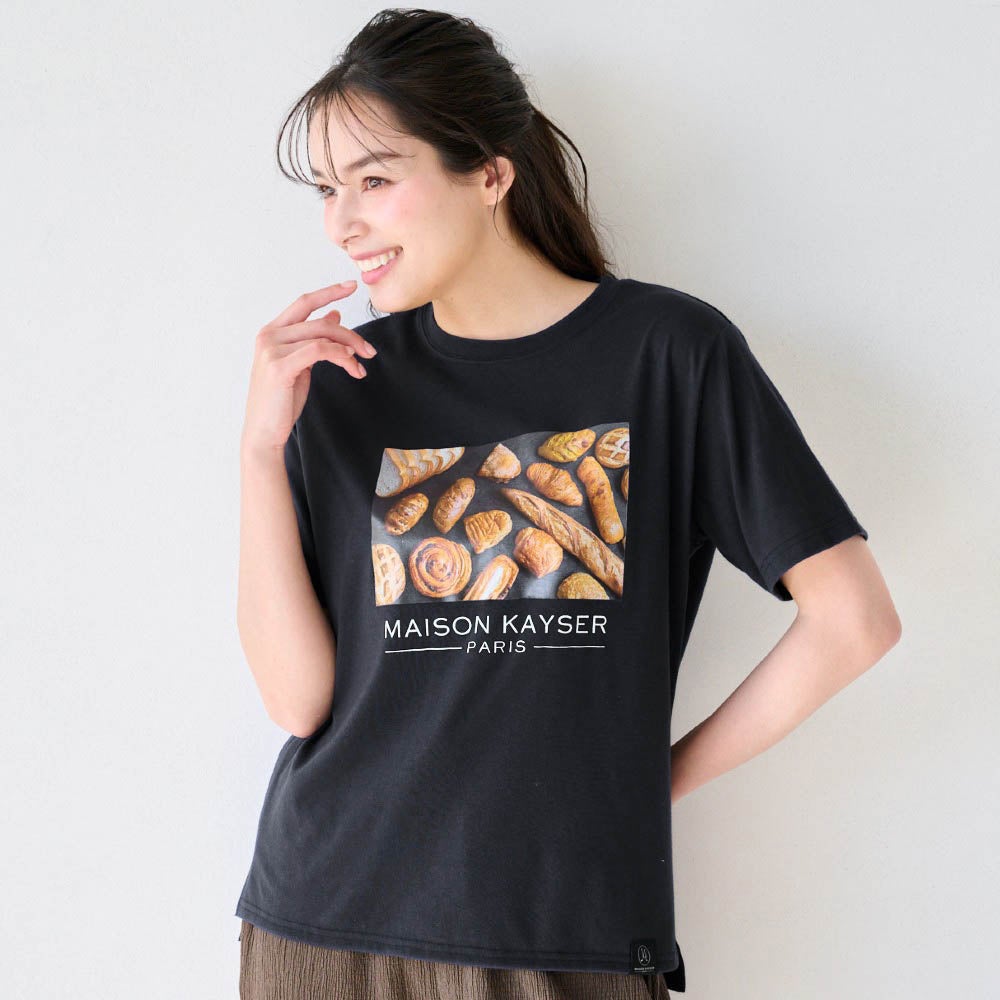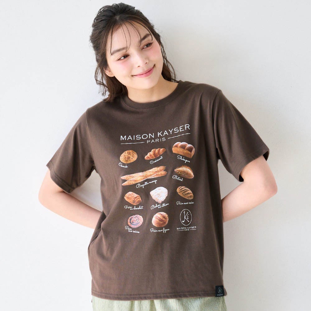 メゾンカイザーで販売しているクロワッサンやバゲットなどをモチーフに、フロント部分に大きめのプリントを施したTシャツです。身生地には綿100%の天竺素材を使用しており、汗を吸収するので暑い季節でも快適な着心地です。どんなボトムスとも合わせやすく、メゾンカイザーのパンをさりげなくアピールできます。ネイビー、エクリュ、ブラウンの3色展開です。