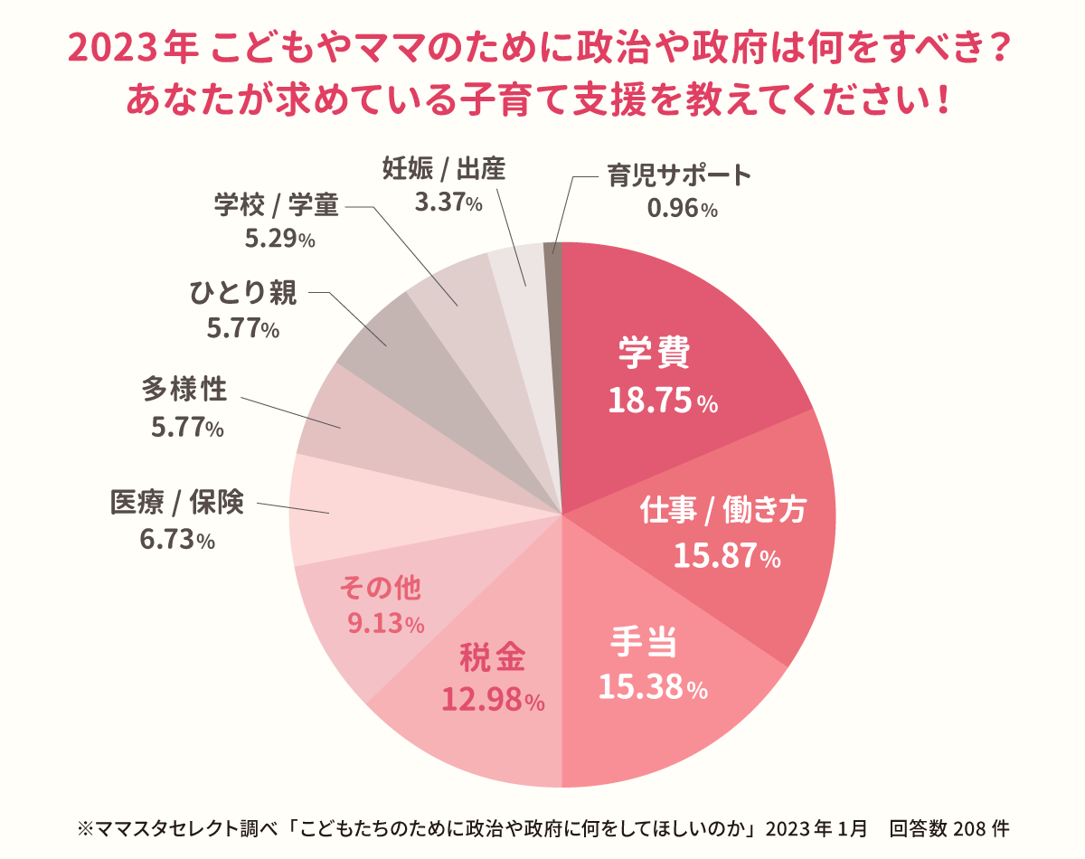 今回のアンケートで圧倒的に多かった意見は「経済的な支援」でした。経済面での支援と一言でいっても、「税制」に関わることから「18歳成人までの医療費無料化」「学業にかかる金銭面の無償化」などと様々。医療費から学費まで、ママたちが負担に感じているものは多岐にわたっていることが分かります。
