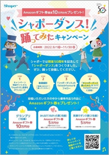 2022年9月1日(木)~11月30日(水)の期間中、シャポーダンスを踊っている動画をTiktokまたはTwitterで投稿いただいた方の中から、Amazonギフト券をプレゼントいたします。