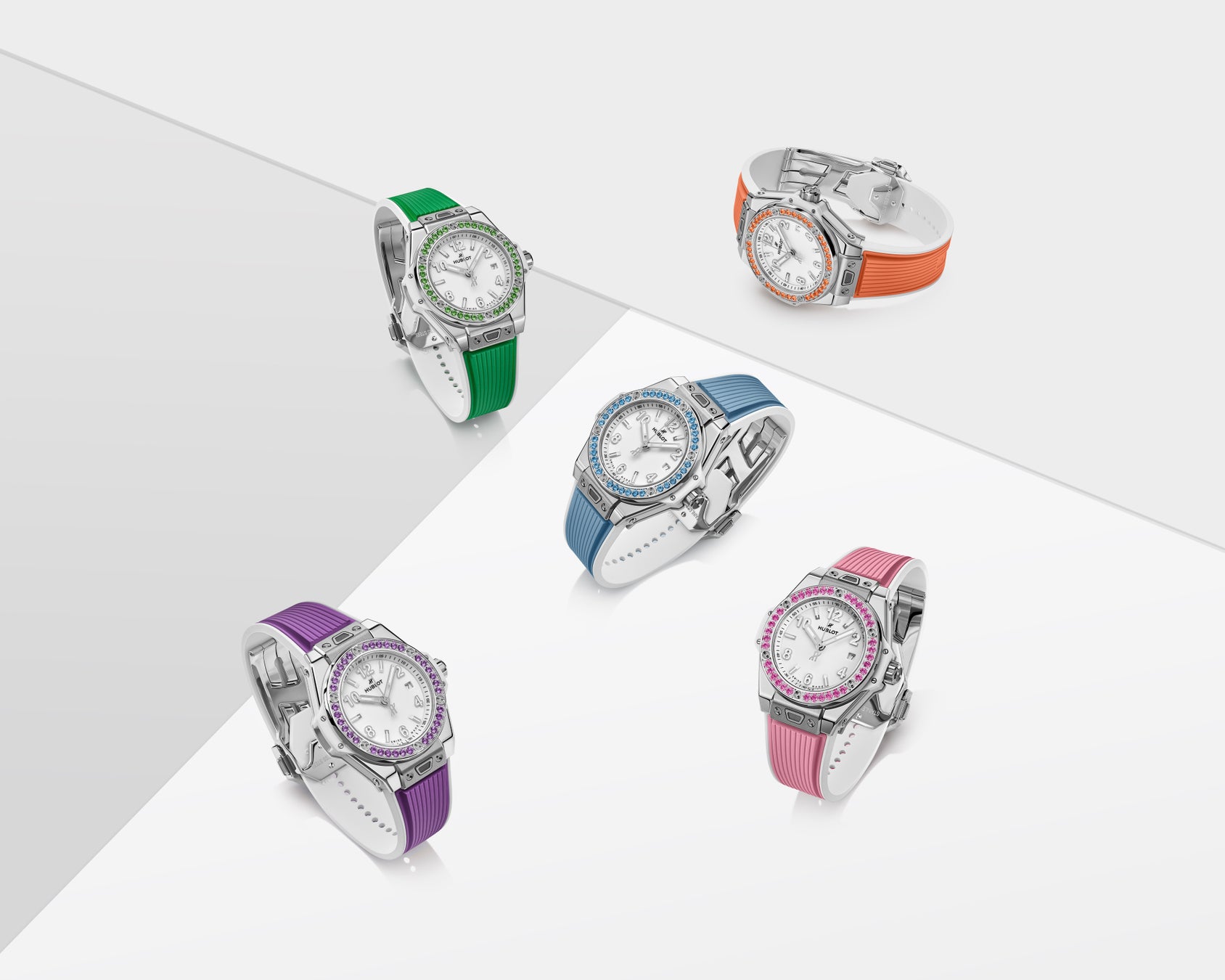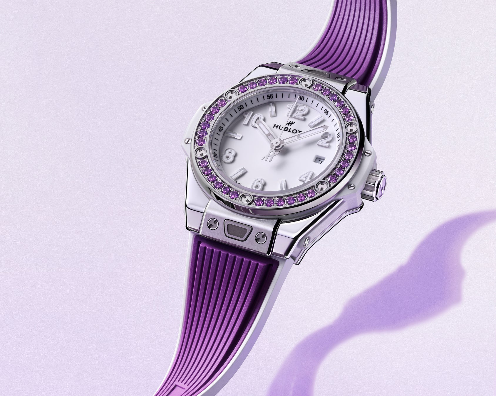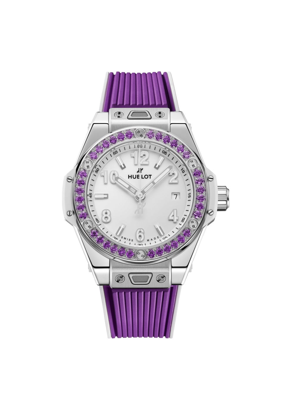 36個のアメジストを配し、アイコニックなH型ビスをあしらったベゼルが、3針と日付表示を備えたシャイニーホワイトのダイアルを縁取ります。約40時間のパワーリザーブを誇る自動巻きムーブメント「HUB1120」を搭載し、ウブロが特許を持つ「ワンクリック」ストラップ交換システムを備えています。ワンクリックで簡単に付け替え可能な2本のストラップ、ひとつはジェムストーンのカラーに合わせたセンターインサートにホワイトのラインが入ったラバーストラップ、もうひとつはホワイトラバーストラップが付属します。
