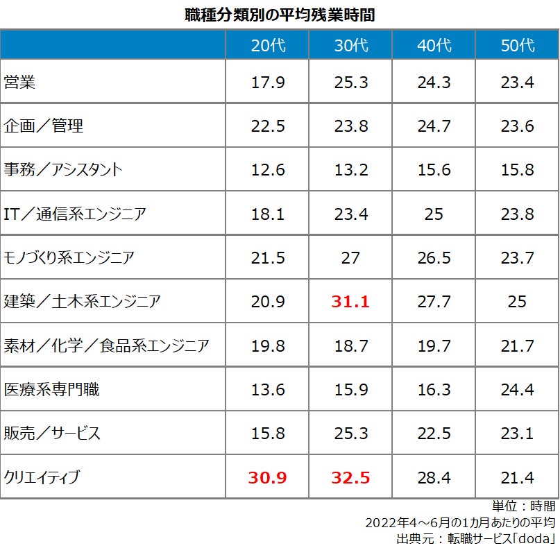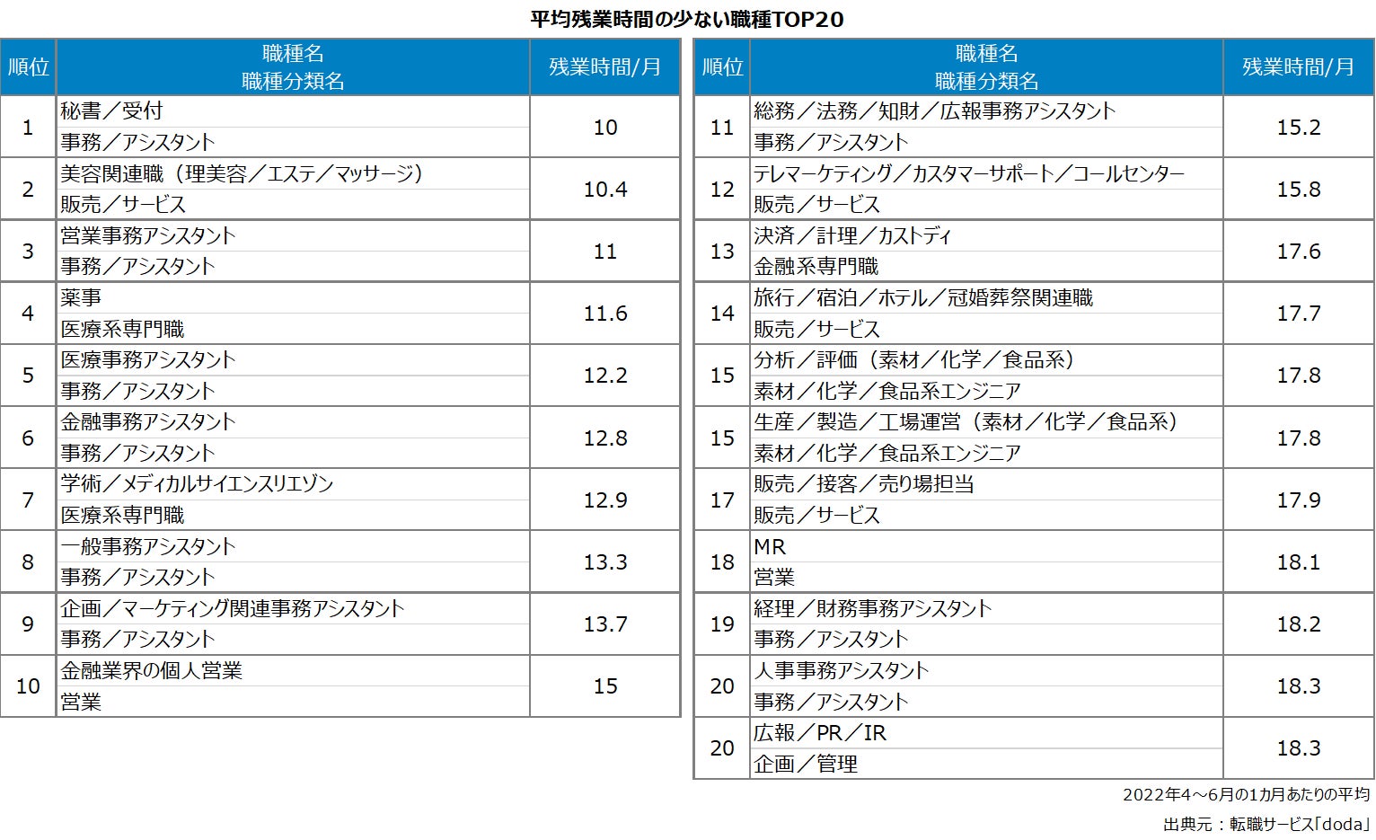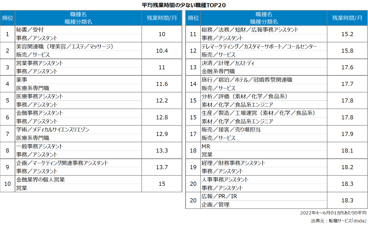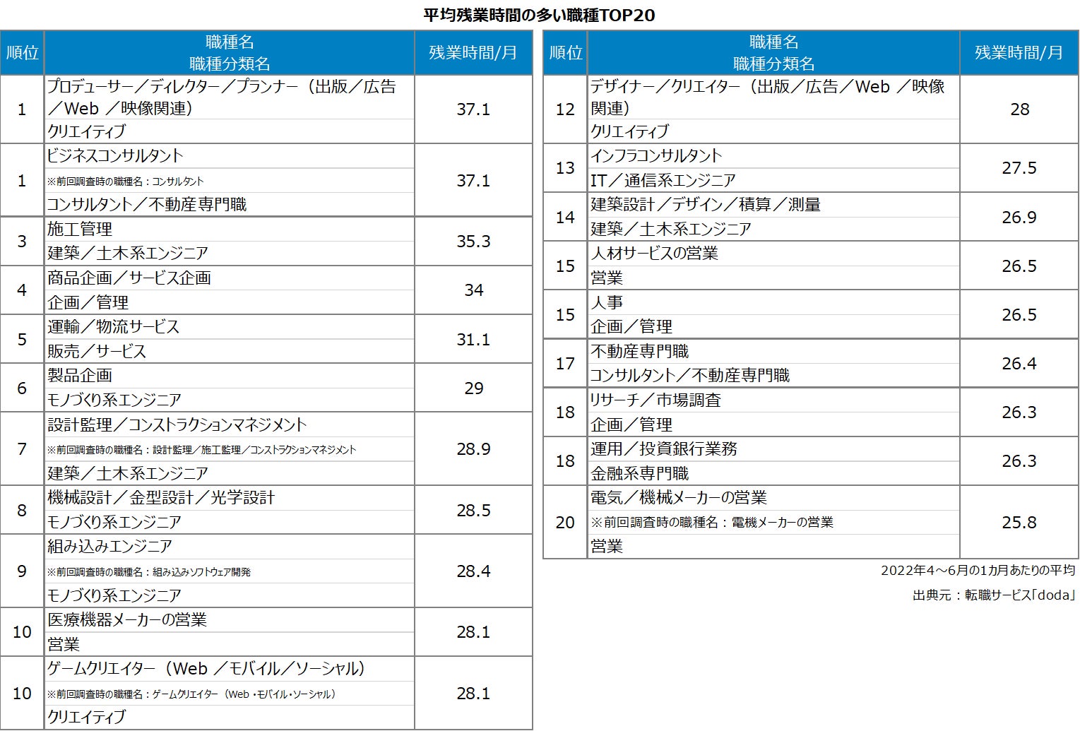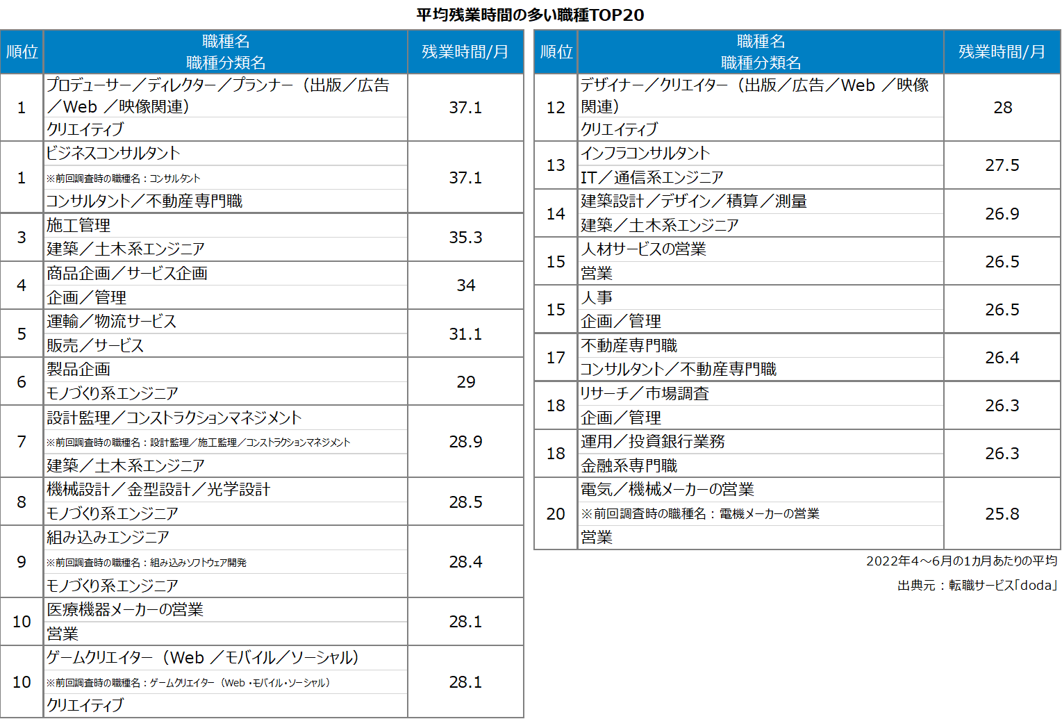 転職サービス「doda(デューダ)」(編集長:大浦 征也)は、20~59歳のビジネスパーソン15,000人を対象に、職種別に残業時間を調査しましたので、結果をお知らせいたします。