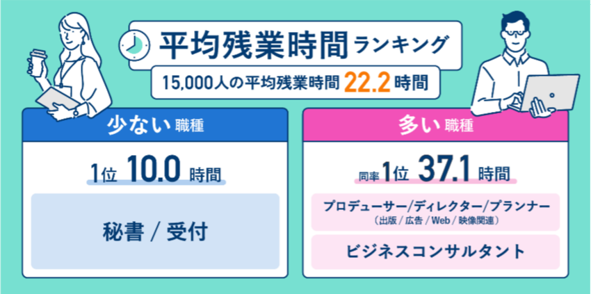 2022年の職種別「平均残業時間」を調査 ひと月の平均残業時間は22.2時間で、前回より1.4時間増