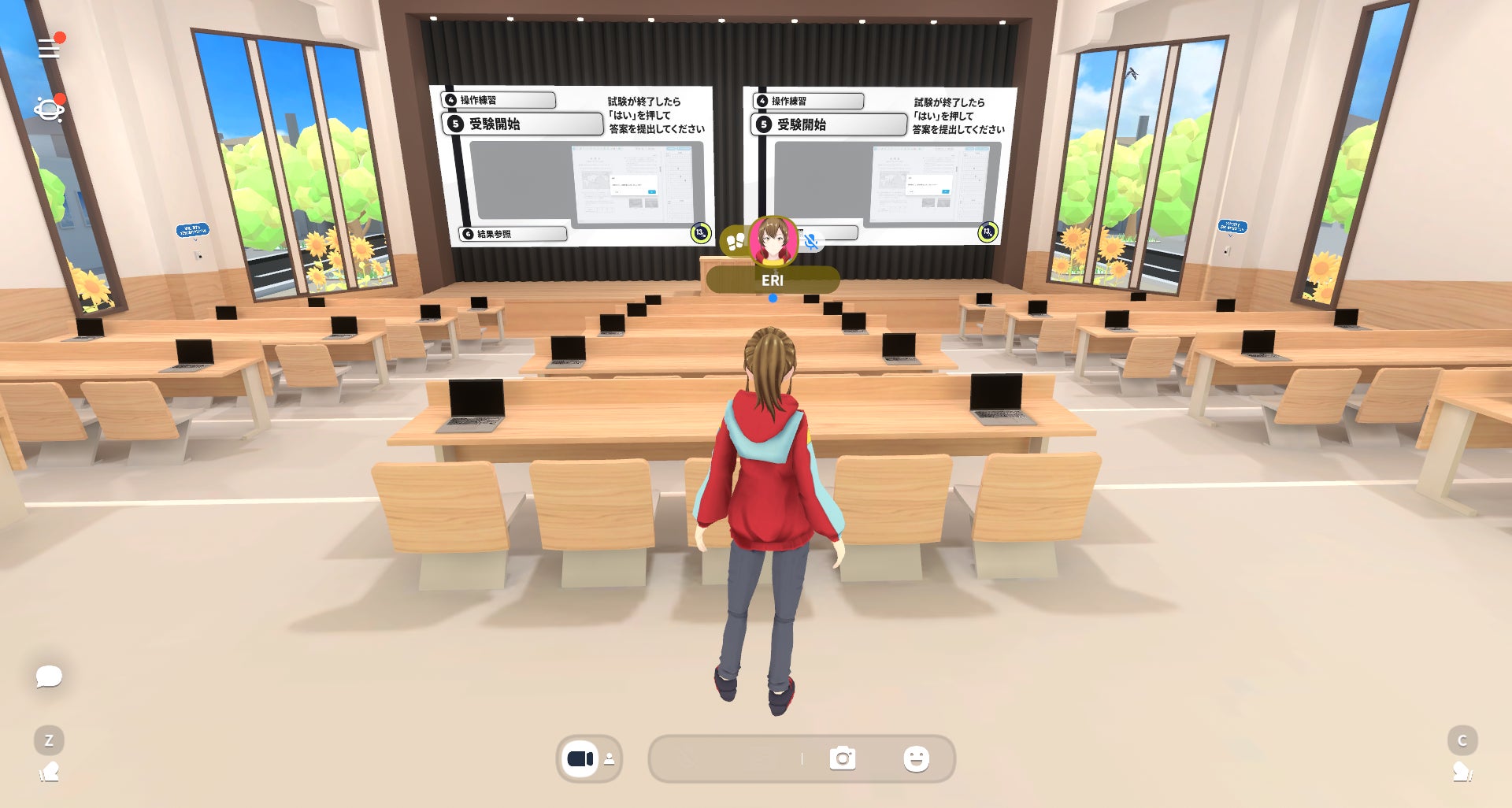 試験会場からコミュニティルームに移動すれば、受験の前後にそれぞれのアバター同士で、ほかの生徒と音声やチャットでコミュニケーションすることもできます。