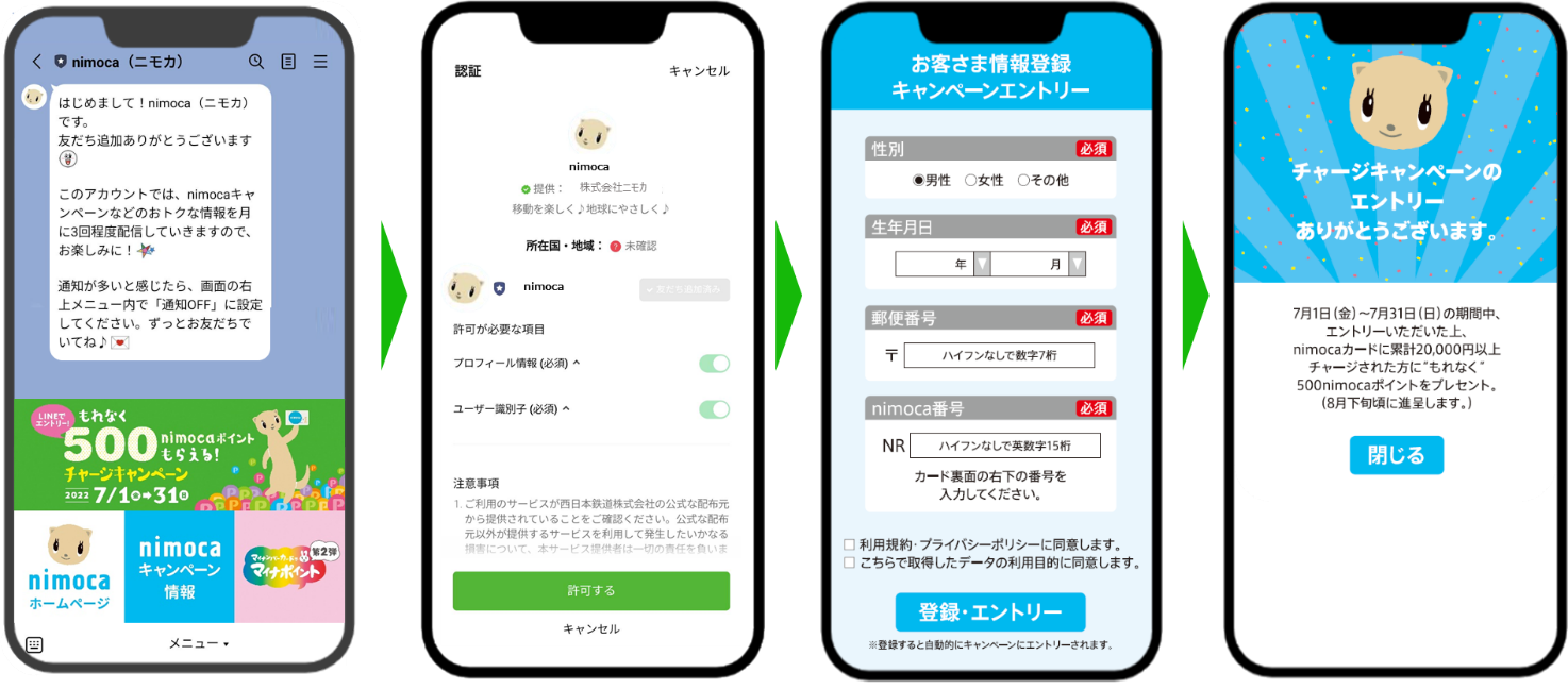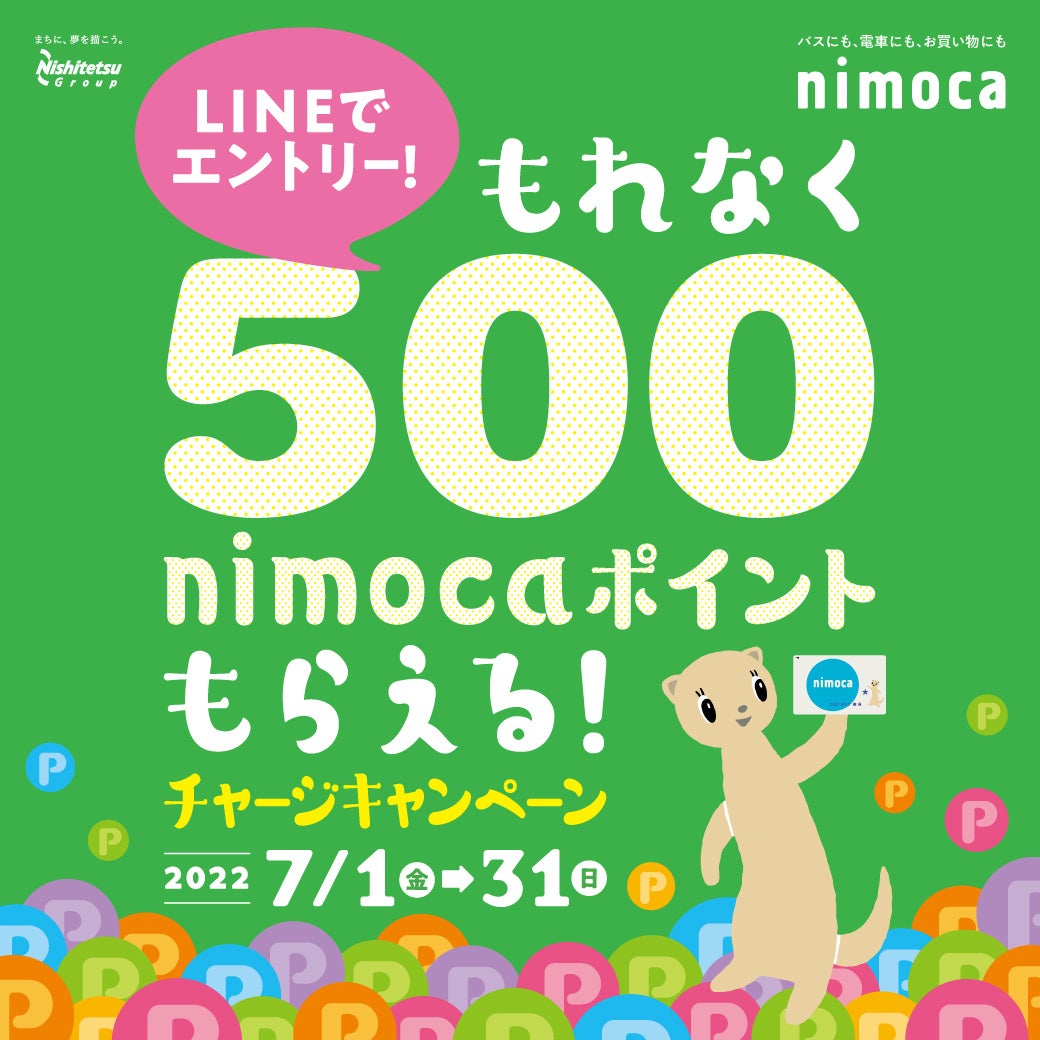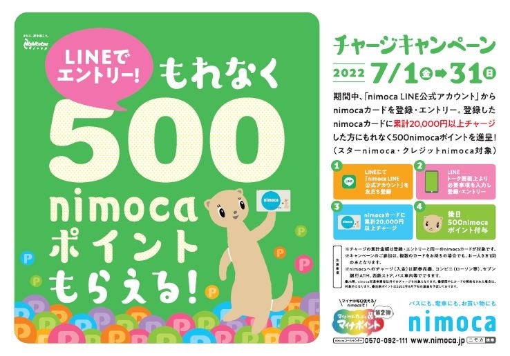 株式会社ニモカ(所在地:福岡県福岡市、代表取締役社長:田端敦)は、2022年7月1日(金)から7月31日(日)までの期間中、「nimoca LINE公式アカウント」からnimocaカードを登録・エントリー&登録したnimocaカードに累計20,000円以上チャージした方に〝もれなく″500nimocaポイントをプレゼントいたします。